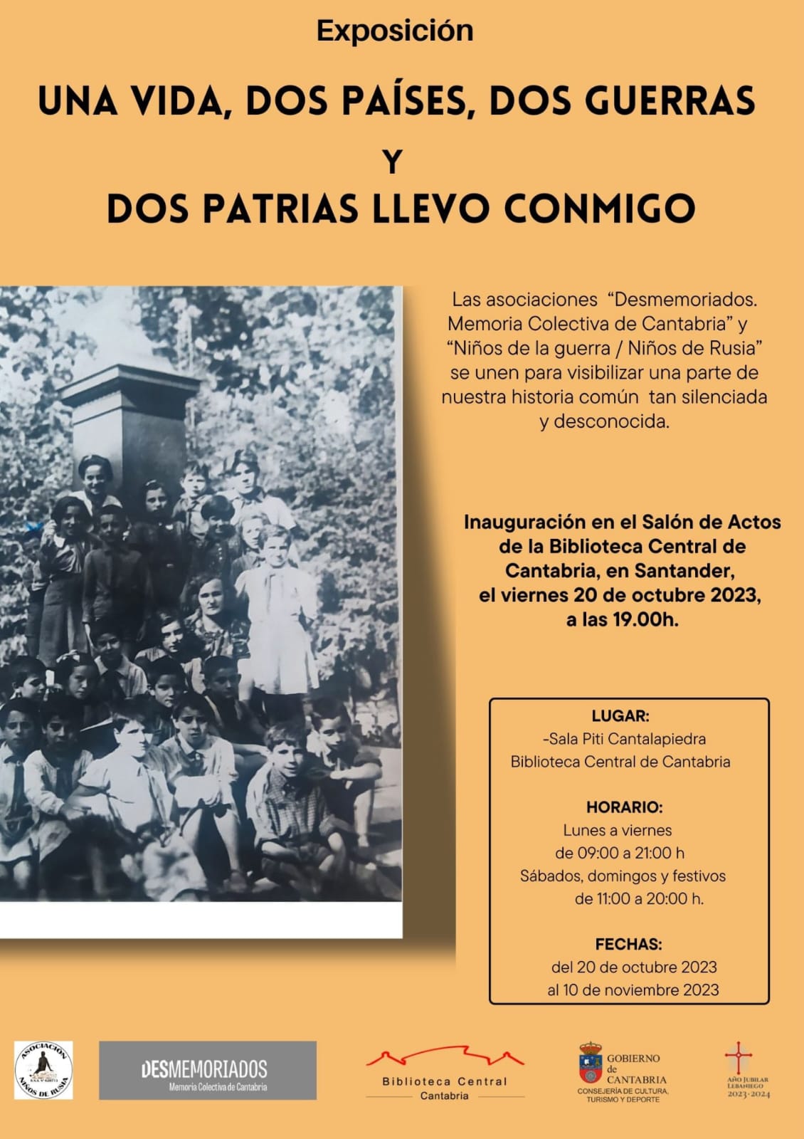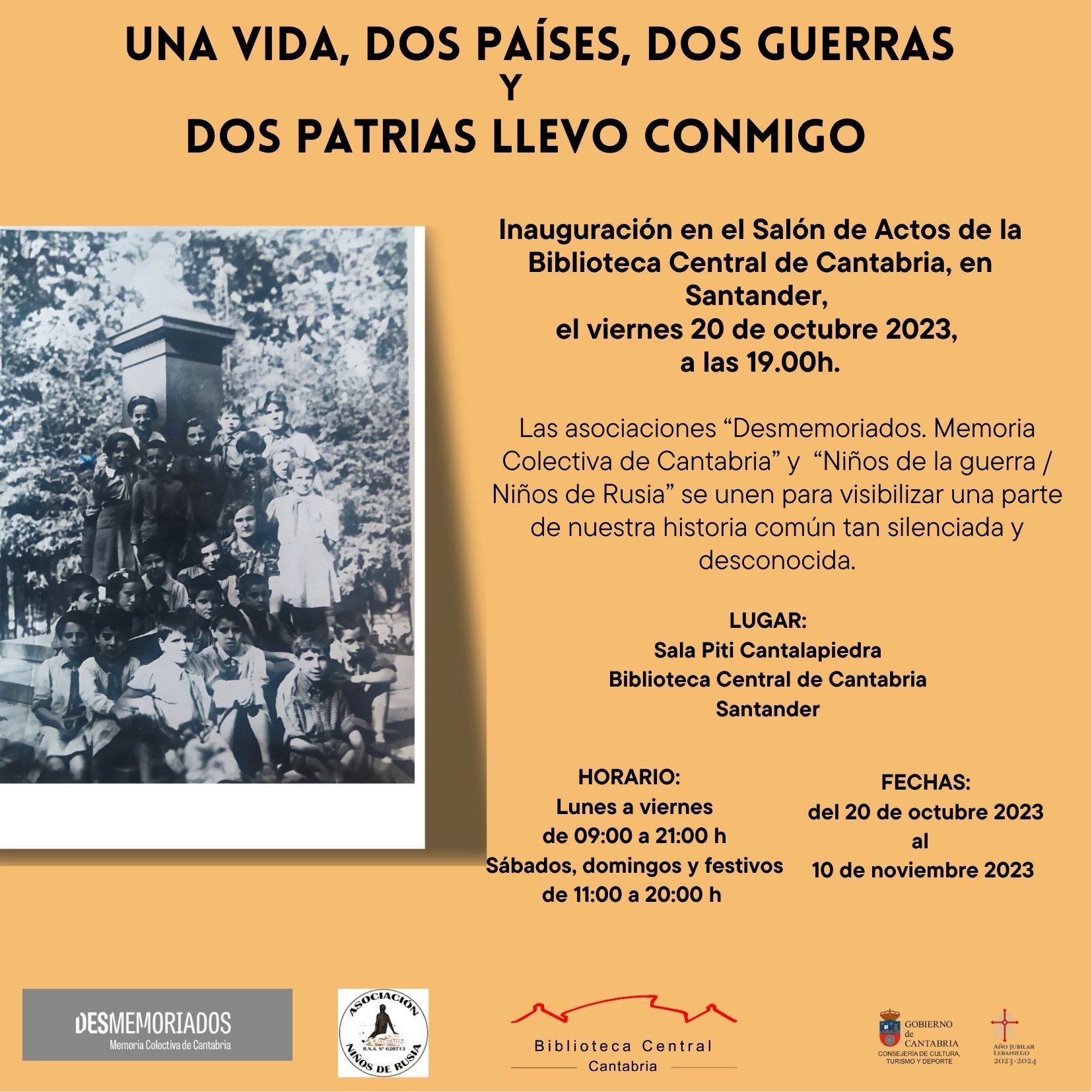 Las asociaciones Desmemoriados. Memoria colectiva de Cantabria y Niños de la Guerra/Niños de Rusia organizan la exposición "Una vida, dos países, dos guerras y dos patrias llevo conmigo" que se inaugura hoy, viernes 20 de octubre, a las 19:00 h, en la Biblioteca Central de Cantabria.