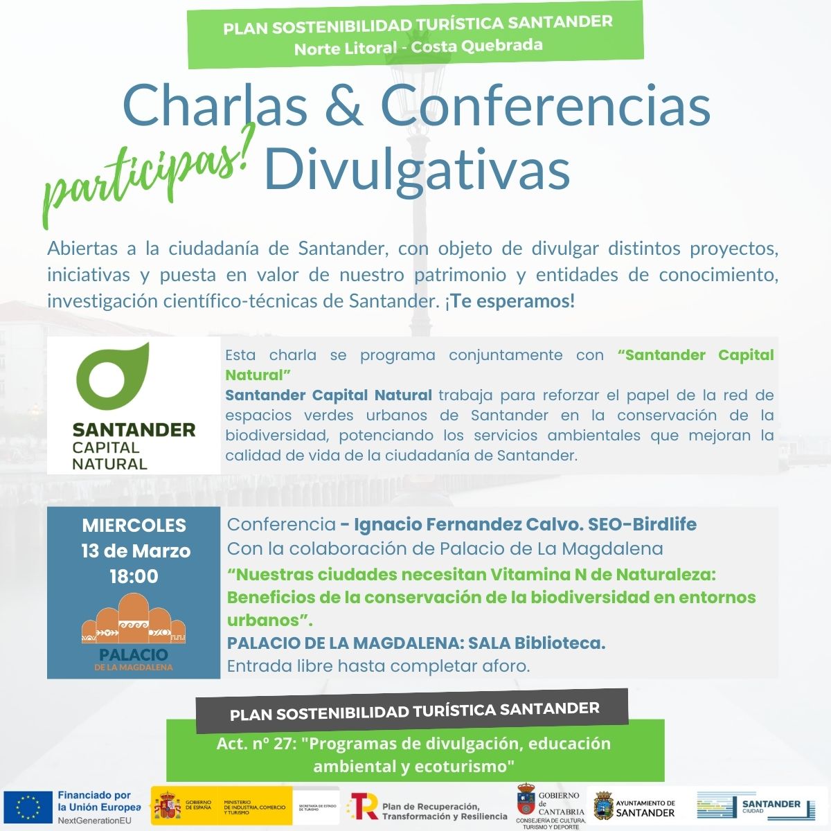 El Palacio de la Magdalena acoge el miércoles 13 de marzo a las 18:00 h una charla en colaboración con Santander Capital Natural, proyecto que busca reforzar el papel de la red de espacios verdes urbanos de Santander en la conservación de la biodiversidad, potenciando los servicios ambientales que mejoran la calidad de vida de la ciudadanía de Santander.