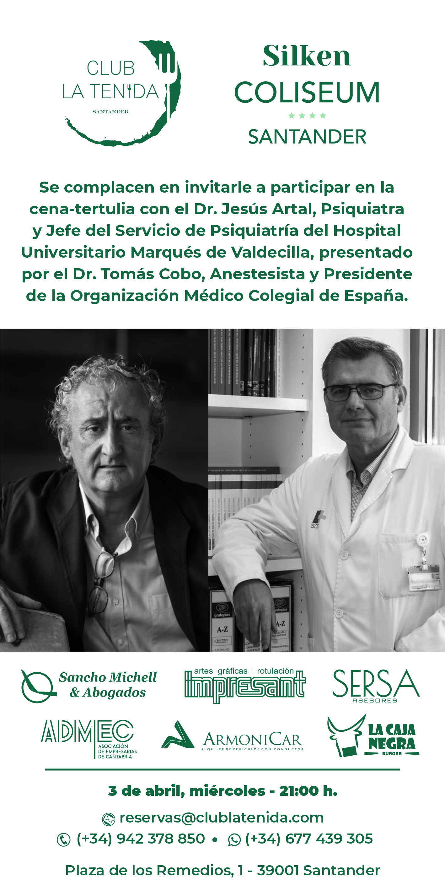 El Club La Tenida organiza una cena-tertulia con Jesús Artal, psiquiatra y jefe de servicio de Psiquiatría del Hospital Universitario Marqués de Valdecilla. Será presentado por Tomás Cobo, anestesista y presidente de la Organización Médico Colegial de España.
