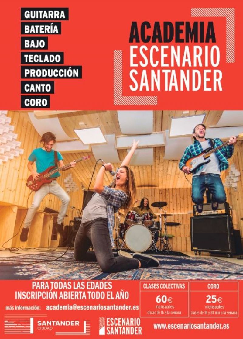 La Academia de Escenario Santander ofrece la oportunidad a adultos y niños de iniciarse o seguir formándose en el mundo de la música. Cursos de octubre a junio, ambos meses inclusive. Disponibilidad de clases de lunes a viernes por la tarde y sábados por la mañana. Cursos adaptados a todas las edades. Clases formadas con alumnos del mismo nivel para avanzar juntos cómodamente.