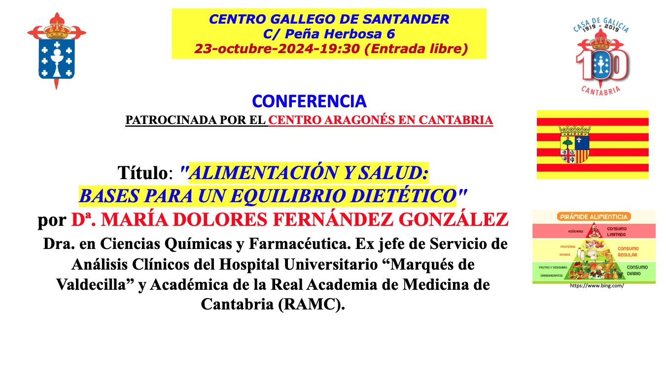 El Centro Gallego de Santander acoge la conferencia "Alimentación y salud: bases para un equilibrio dietético" impartida por Mª Dolores Fernández, doctora en Ciencias Químicas y Farmacéutica. Ex jefa de Servicio de Análisis Clínicos del Hospital Universitario Marqués de Valdecilla y Académica de la Real Academia de Medicina de Cantabria (RAMC).
