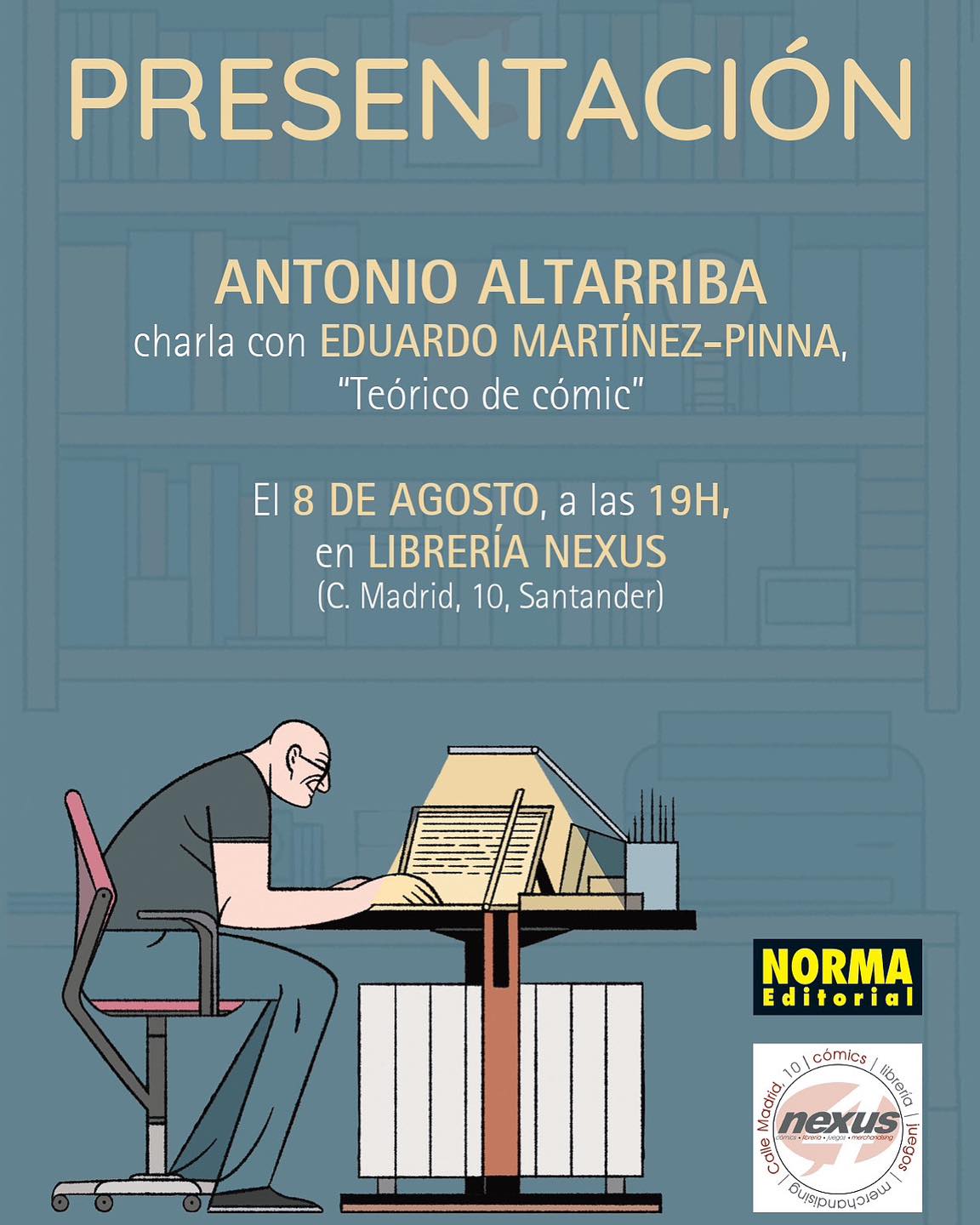 Aprovechando su paso por la Universidad Internacional Menéndez Pelayo para impartir el curso “Cómic. Auge de una vieja forma de expresión. Historia, lenguaje y prácticas”, la Librería especializada Nexus 4, de Santander, acoge el jueves 8 de agosto un encuentro con Antonio Altarriba, guionista de cómics y Premio Nacional de Cómic en 2010, por su obra, “El arte de volar”, junto al dibujante Kim. Charlará con el autor el teórico sobre cómic Eduardo Martínez-Pina.
