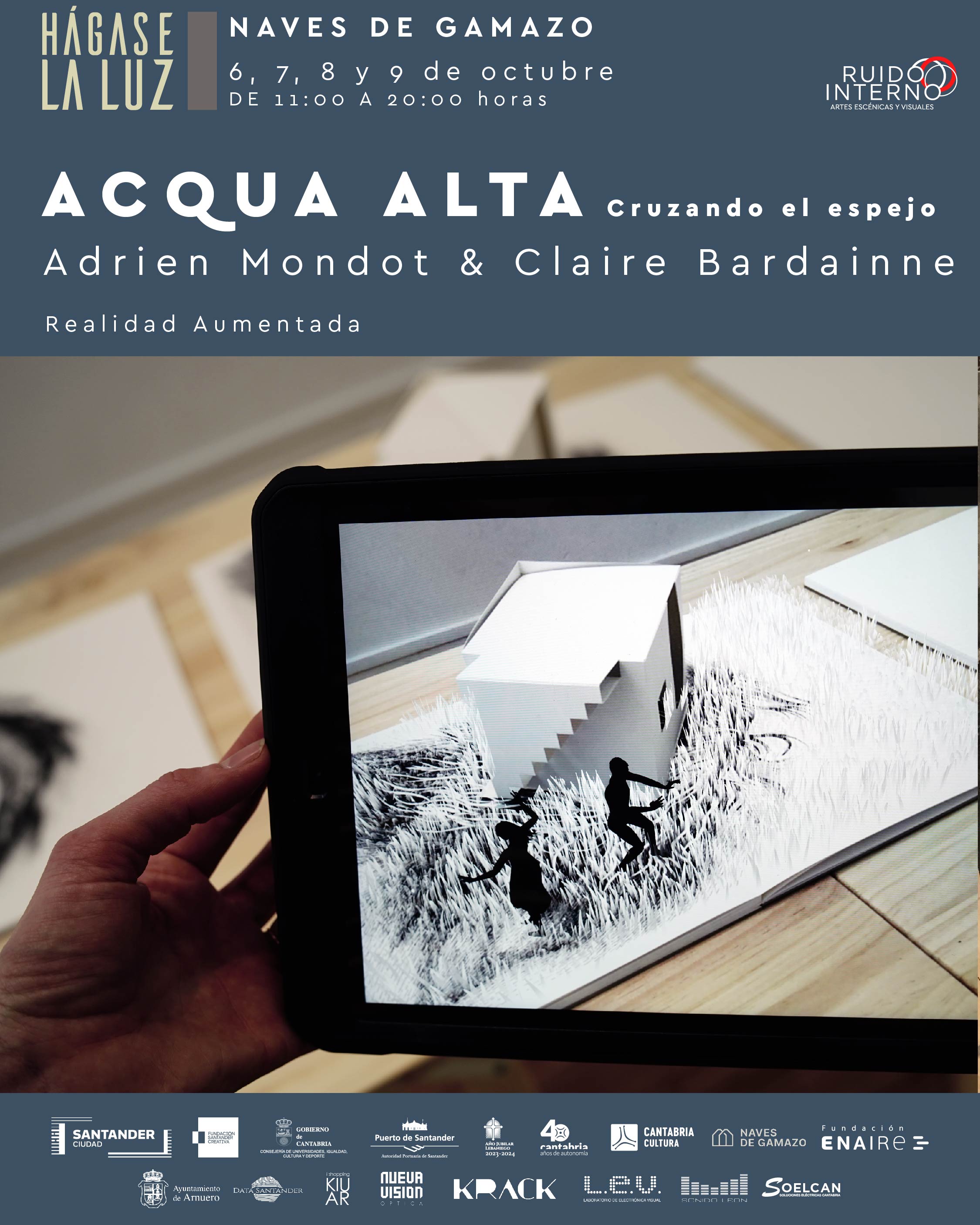 En las Naves de Gamazo de la Fundación Enaire se podrá asistir a la experiencia de realidad aumentada “Acqua alta. Cruzando el espejo” , una propuesta de Adrien M & Claire B. La experiencia muestra un libro pop-up cuyos dibujos y volúmenes de papel se convierten en el decorado de una historia, solo visible en realidad aumentada.