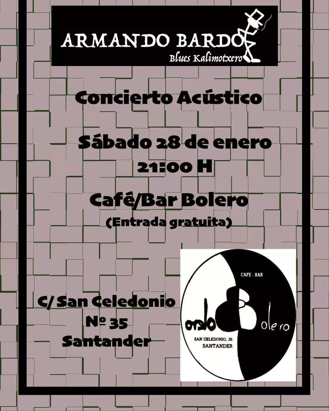 Armando Bardo en concierto acústico en el Bar Bolero este sábado 28 de enero a las 21:00 horas. Entrada libre.