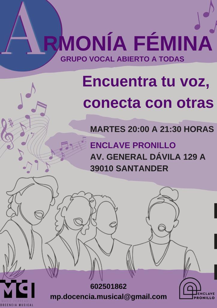 Armonía Fémina es un grupo vocal de armonía cercana para voces femeninas (tipo “barbershop”). Es un proyecto innovador y de nueva creación en el que un conjunto de mujeres de Santander forman una comunidad donde experimentan y aprenden a cantar juntas en un estilo musical muy minoritario y poco conocido en España, pero que ofrece múltiples beneficios para las integrantes, tanto a nivel psicosocial como físico.