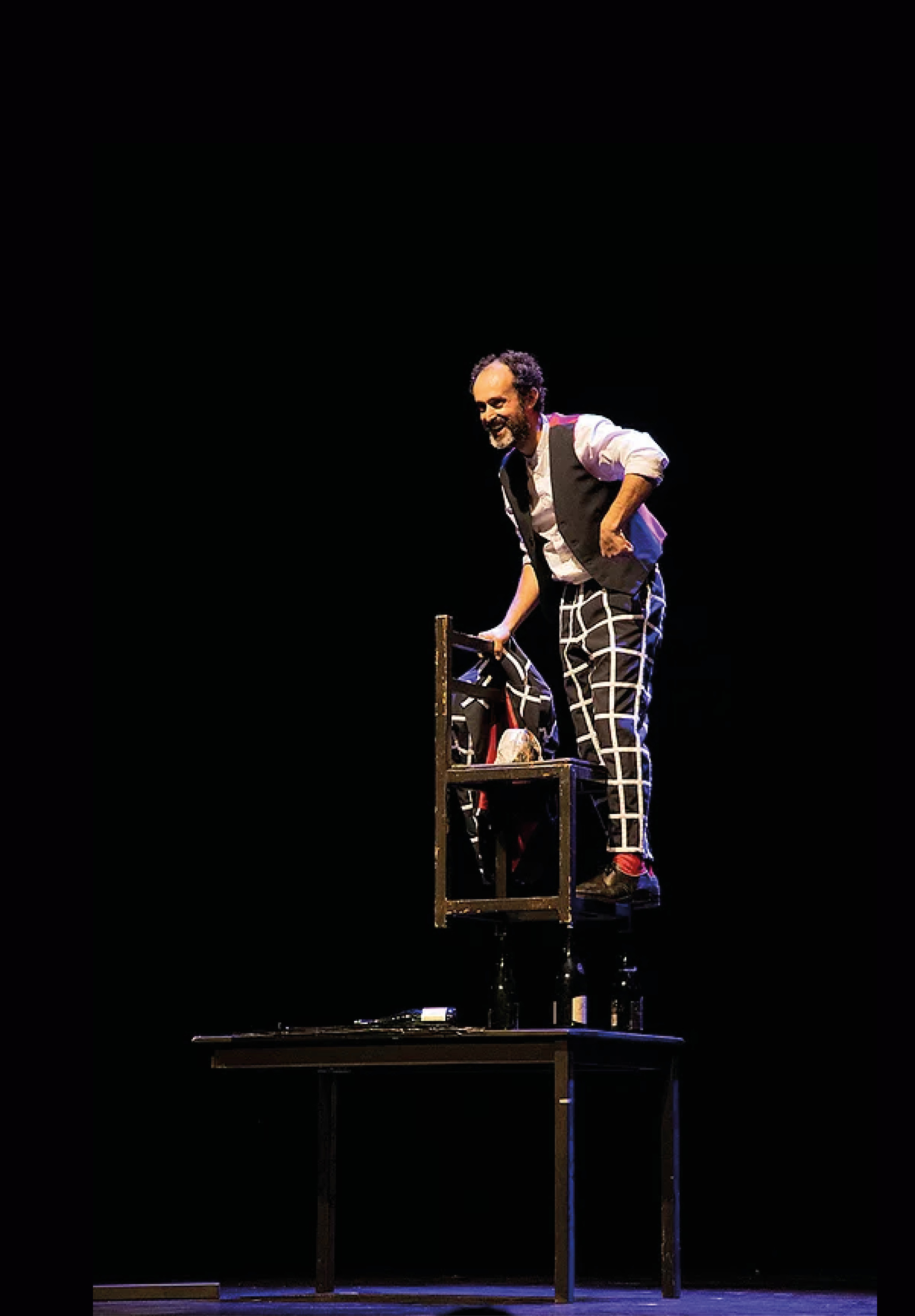 “Arriba” es un espectáculo de circo con texto y sin música en directo, humor y desequilibrios sobre objetos y botellas de vidrio para todos los públicos.