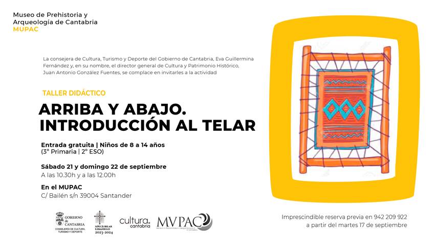 El Museo de Prehistoria y Arqueología de Cantabria (MUPAC) organiza la actividad didáctica "Arriba y abajo. Introducción al telar". Para niños y jóvenes de 8-14 años (3º Primaria / 2º E.S.O.), tendrá lugar los días 21 y 22 de septiembre, en dos sesiones, a las 10:30 y a las 12:00 h.
