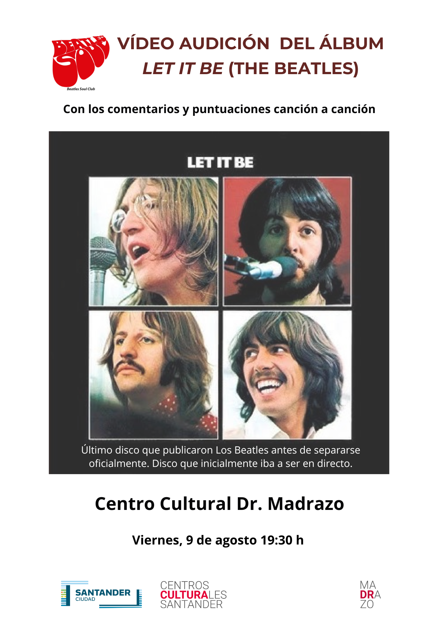 El viernes 9 de agosto, a las 19:30 h, la asociación Beatles Soul Club ofrecerá, en el Centro Cultural Doctor Madrazo, un documental de elaboración propia sobre el disco "Let it be" de The Beatles.