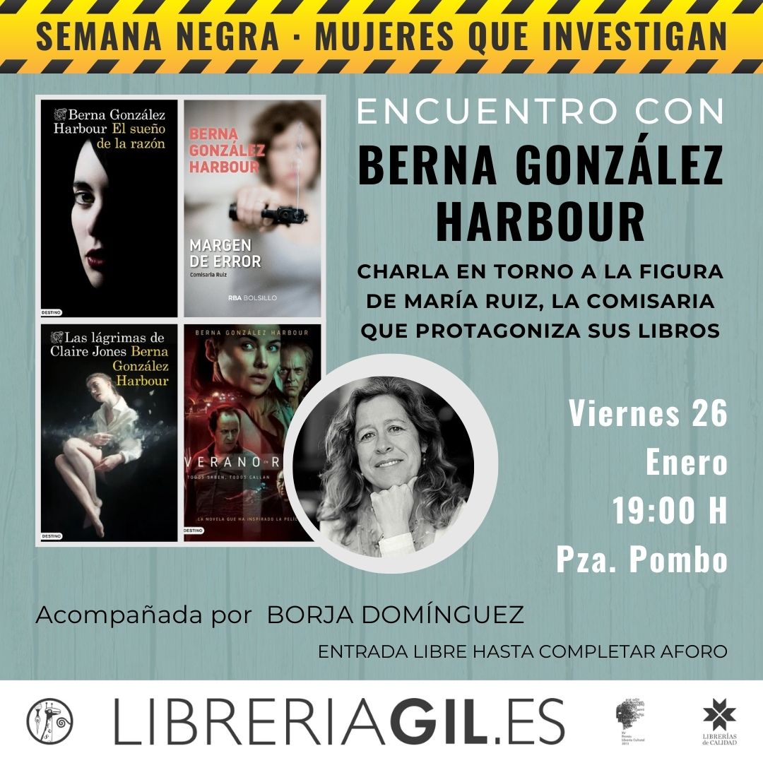 El viernes 26 de enero, a las 19:00 h. la Librería Gil a recibe a la escritora Berna González Harbour, dentro de las actividades de la semana dedicada a las Mujeres en la Novela Negra. La charla girará en torno a la figura de María Ruiz, la comisaria que protagoniza sus libros.