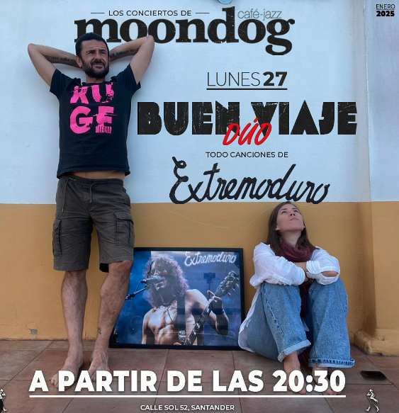 Lunes de concierto en el Moondog. En esta ocasión reciben la visita de Buen Viaje Dúo, que presentan en esta ocasión un repertorio íntegramente formado por canciones de Extremoduro