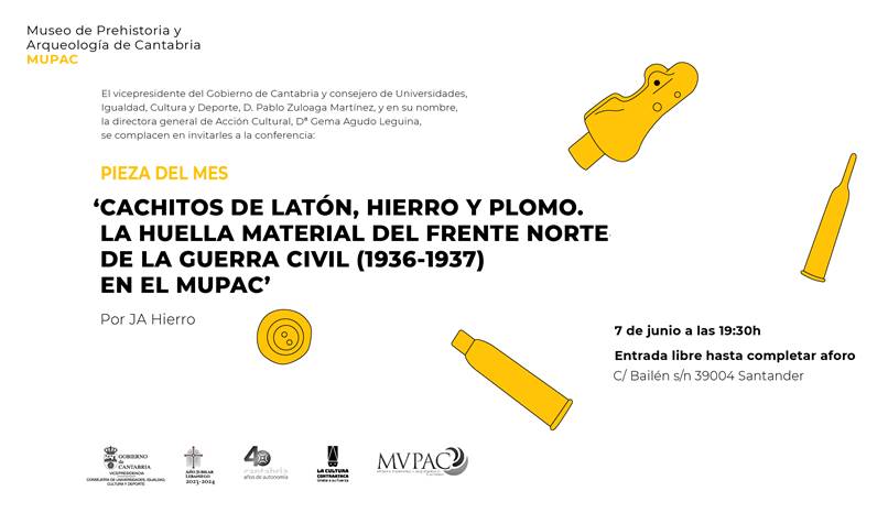 Dentro del ciclo “La pieza del mes”, el Museo de Prehistoria y Arqueología (MUPAC) acoge la conferencia “Cachitos de latón, hierro y plomo. La huella material del frente norte de la Guerra Civil (1936-1937) en el MUPAC”, que impartirá J.A. Hierro el 7 de junio a las 19:30 horas.