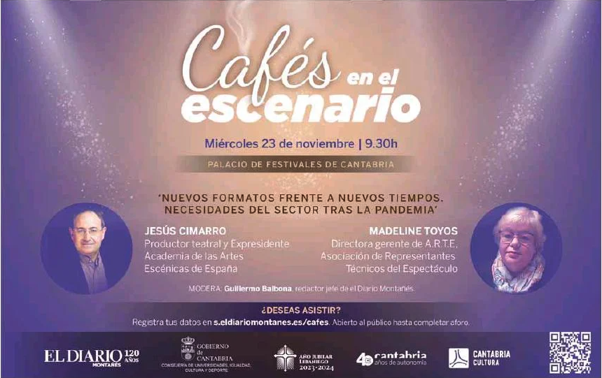 El Diario Montañés, con el patrocinio de Vicepresidencia de Cantabria, organiza el ciclo “Cafés en el escenario” en el que se analizará la situación escénica y cultural del país. En el propio escenario de la Sala Argenta del Palacio de Festivales, distintos invitados con una gran relevancia en el sector cultural, conversarán a modo de coloquio con el redactor jefe de Cultura de El Diario Montañés, Guillermo Balbona.