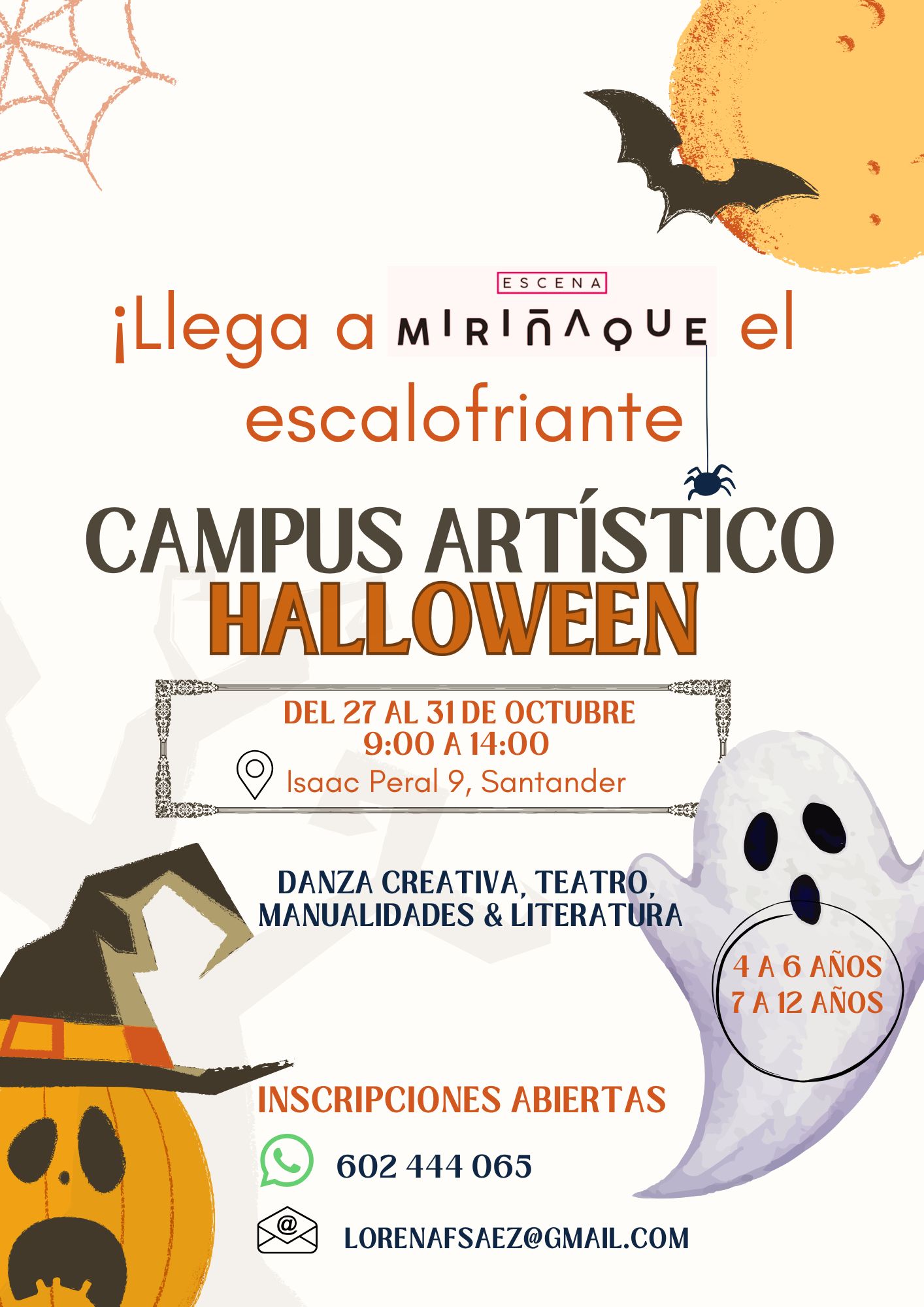 Del 27 al 31 de octubre llega a Escena Miriñaque el Campus Artístico de Halloween, una experiencia para niños y niñas de 4 a 12 años donde la danza creativa, el teatro, la literatura, las manualidades, los juegos y animaciones se unen para disfrutar de la magia y la fantasía de Halloween.
