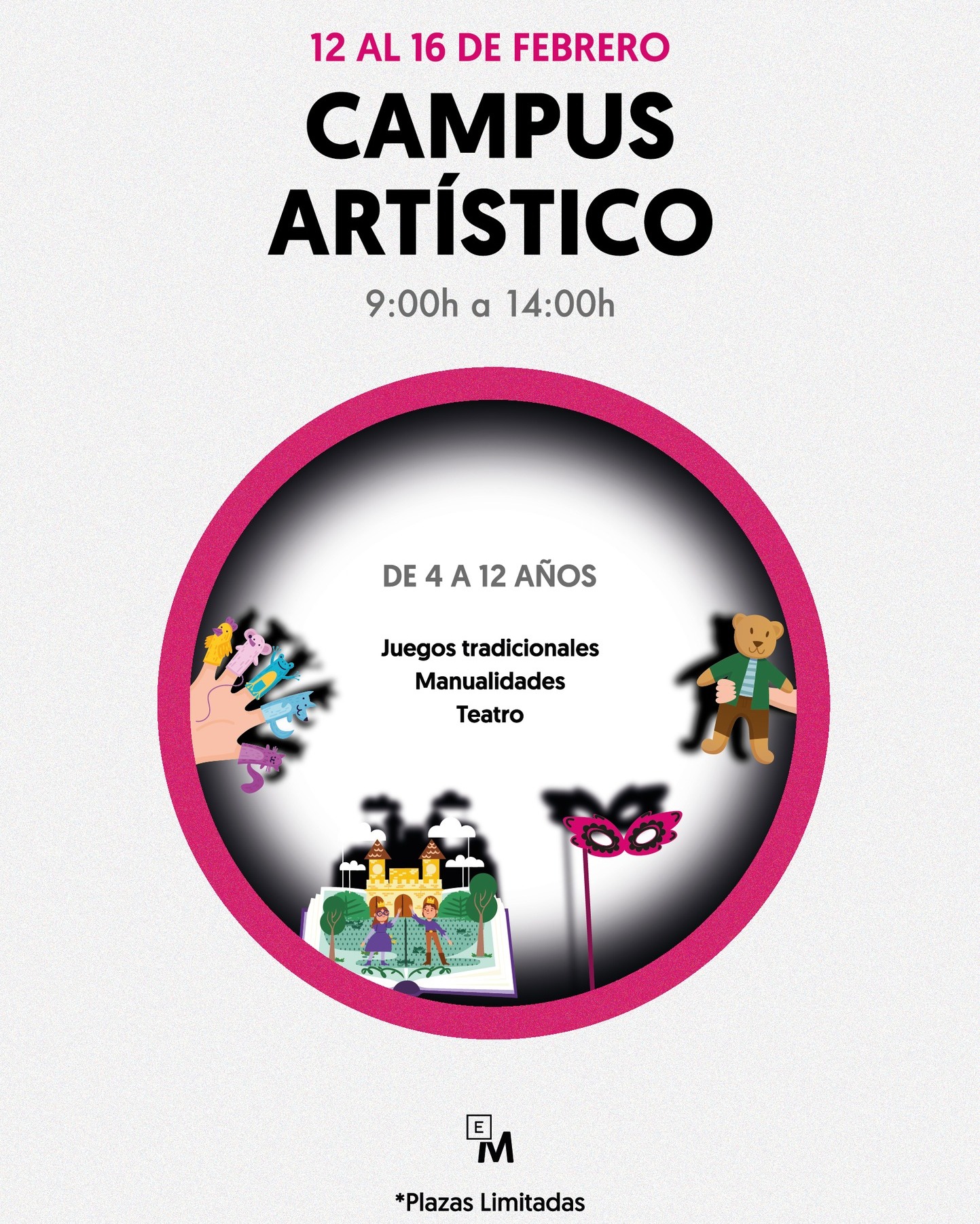 Escena Miriñaque ofrece un Campus Artístico durante la semana no lectiva del 12 al 16 de febrero, en horario de 9:00h a 14:00h, dirigida a niños/as de 4 a 12 años que quieran disfrutar en la semana de descanso escolar de una experiencia divertida y creativa.