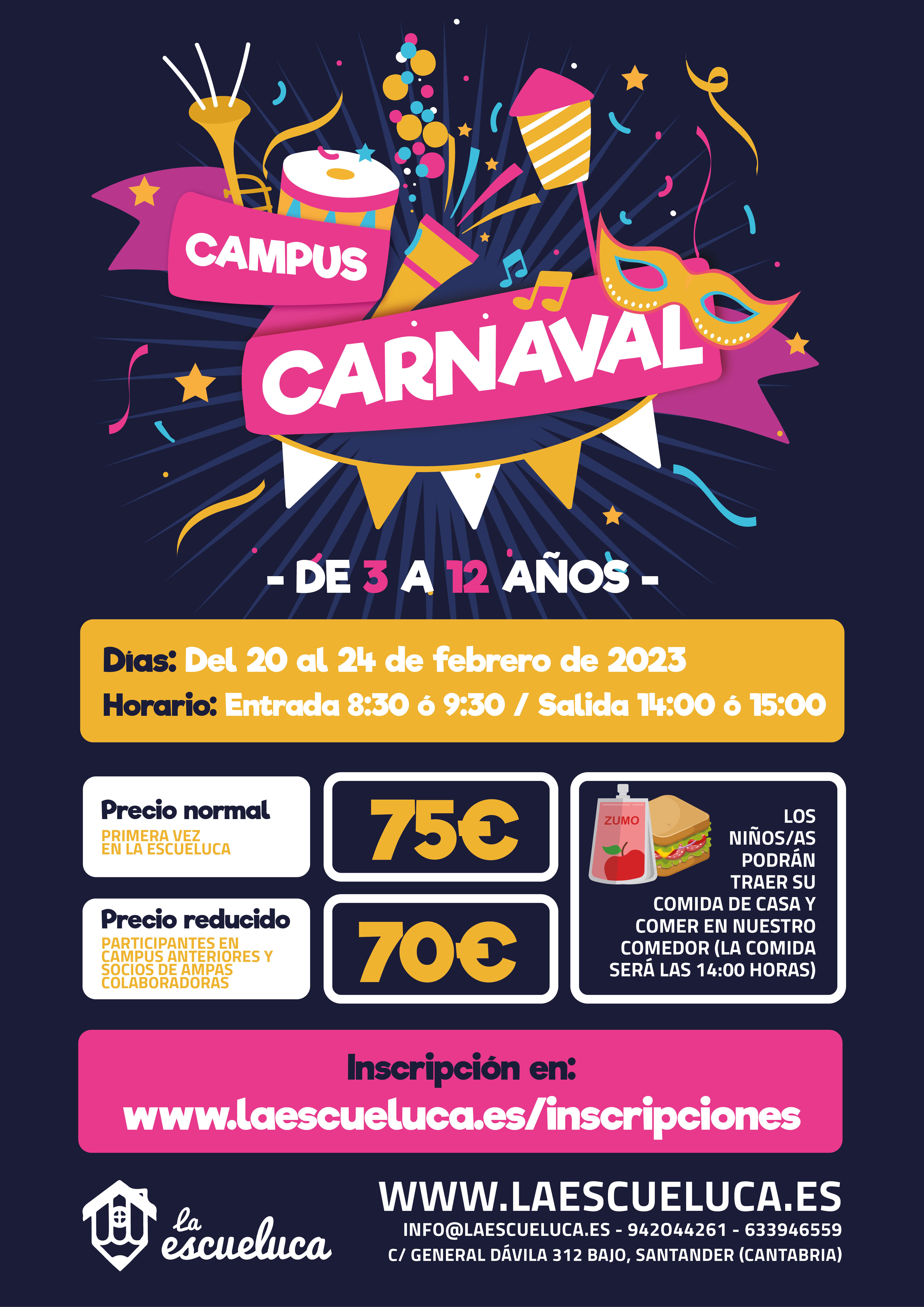 Ya está abierto el plazo para apuntarse al Campus de Carnaval de La Escueluca. Se desarrollará del 20 al 24 de febrero, dirigido a niñas y niños de 3 a 12 años.