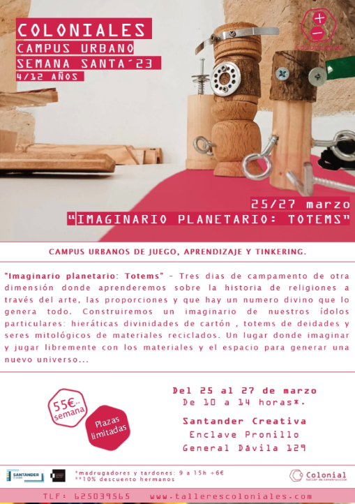 Bajo el título “Imaginario planetario: Totems”, ofrece tres días de campamento de otra dimensión, donde los participantes aprenderán sobre la historia de religiones a través del arte, las proporciones y que hay un numero divino que lo genera todo. Construirán un imaginario de nuestros ídolos particulares: hieráticas divinidades de cartón, totems de deidades y seres mitológicos de materiales reciclados. Un lugar donde imaginar y jugar libremente con los materiales y el espacio para generar una nuevo universo...
