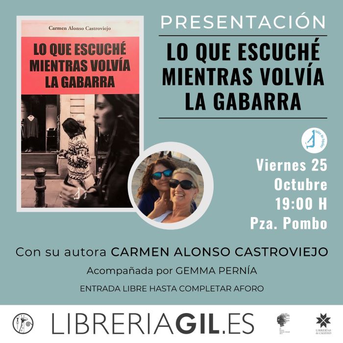 El viernes, 25 de octubre, a las 19:00 h.tendrá lugar en Gil la presentación de “Lo que escuché mientras volvía la gabarra”, de Carmen Alonso Castroviejo. Acompaña a la autora Gemma Pernía. (Editorial Talón de Aquiles).