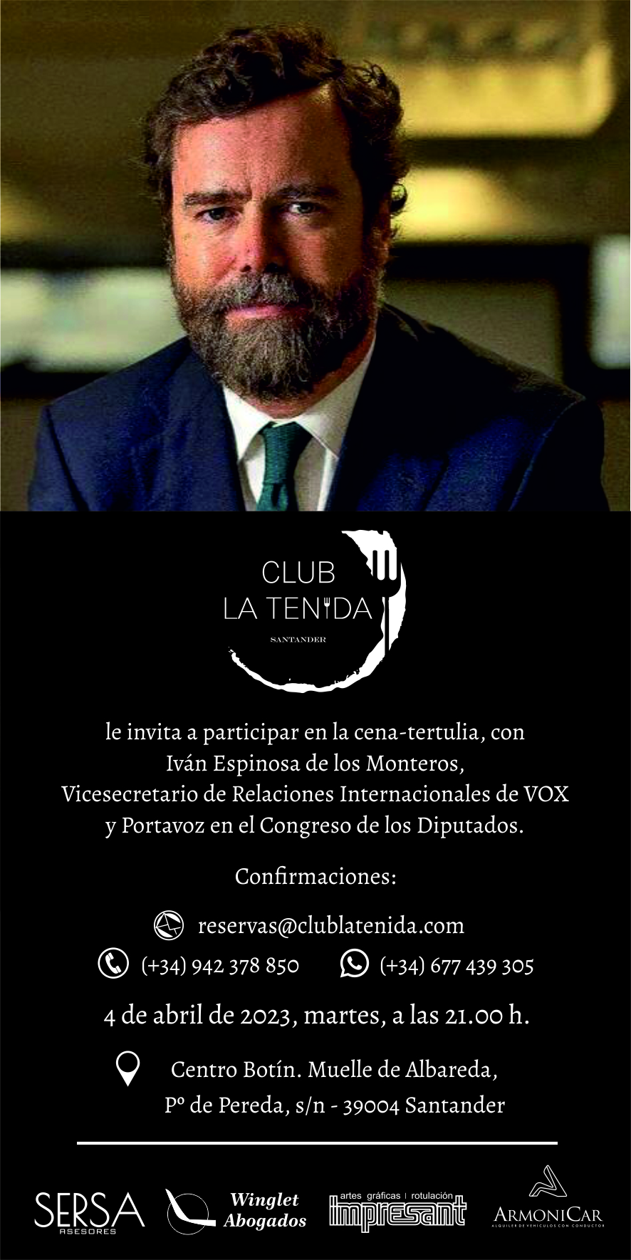 El Club La Tenida organiza una cena-tertulia con Iván Espinosa de los Monteros, vicesecretario de Relaciones Internacionales de VOX y portavoz de esa formación en el Congreso de los Diputados.