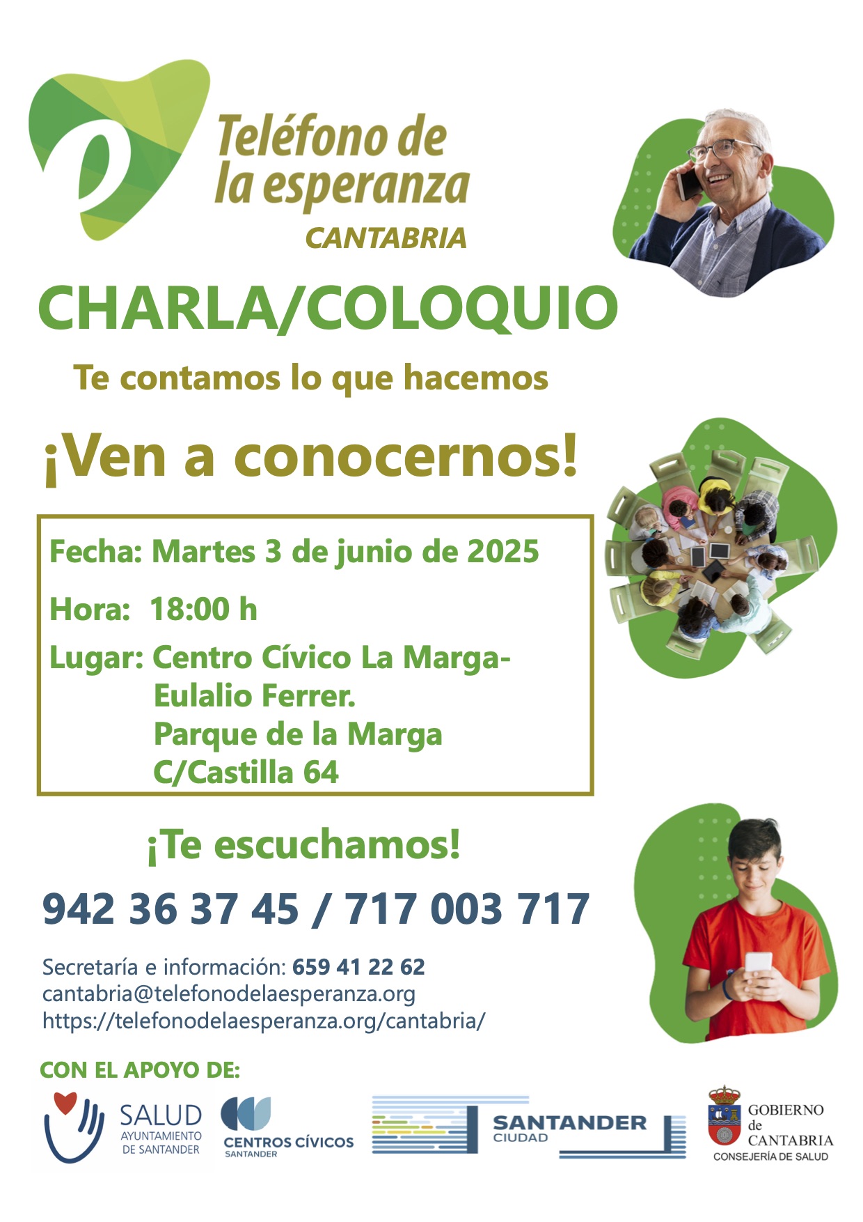 El teléfono de la Esperanza en Cantabria ofrece charlas para dar a conocer a la población qué es y cuáles son las actividades que realiza en apoyo a personas en crisis y/o soledad no elegida, así como los Cursos de Formación de Voluntariado y otros talleres para autogestión de emociones y apoyo en momentos de crisis.