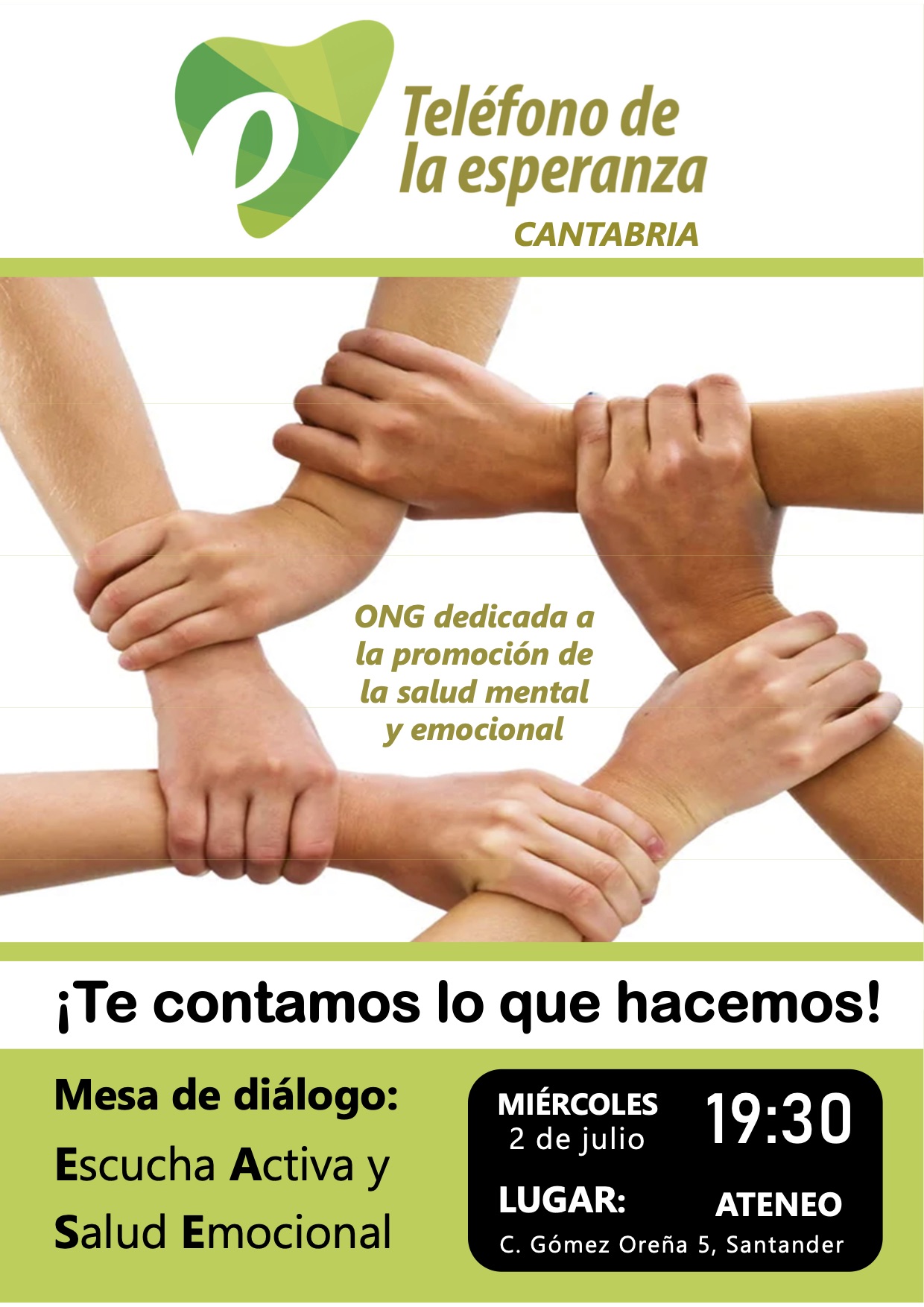 El teléfono de la Esperanza en Cantabria ofrece charlas para dar a conocer a la población qué es y cuáles son las actividades que realiza en apoyo a personas en crisis y/o soledad no elegida, así como los Cursos de Formación de Voluntariado y otros talleres para autogestión de emociones y apoyo en momentos de crisis.