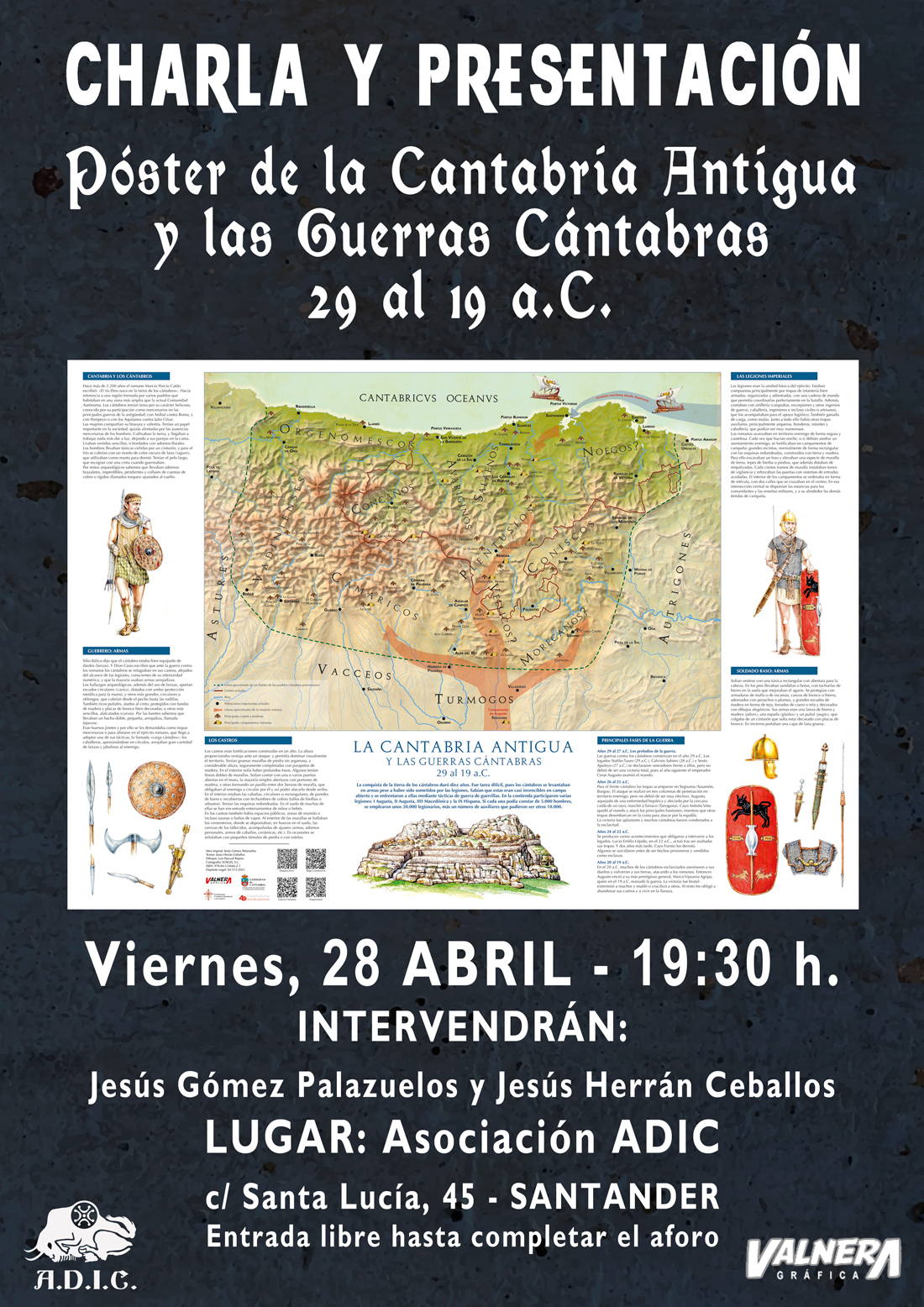 El 28 de abril la sede de ADIC acoge la charla y presentación del póster divulgativo de la Cantabria Antigua y las Guerras Cántabras (29 al 19 a.C.). Intervendrán Jesús Gómez Palazuelos, autor de la idea original, y Jesús Herrán Ceballos, autor de los textos y director de la editorial Valnera.