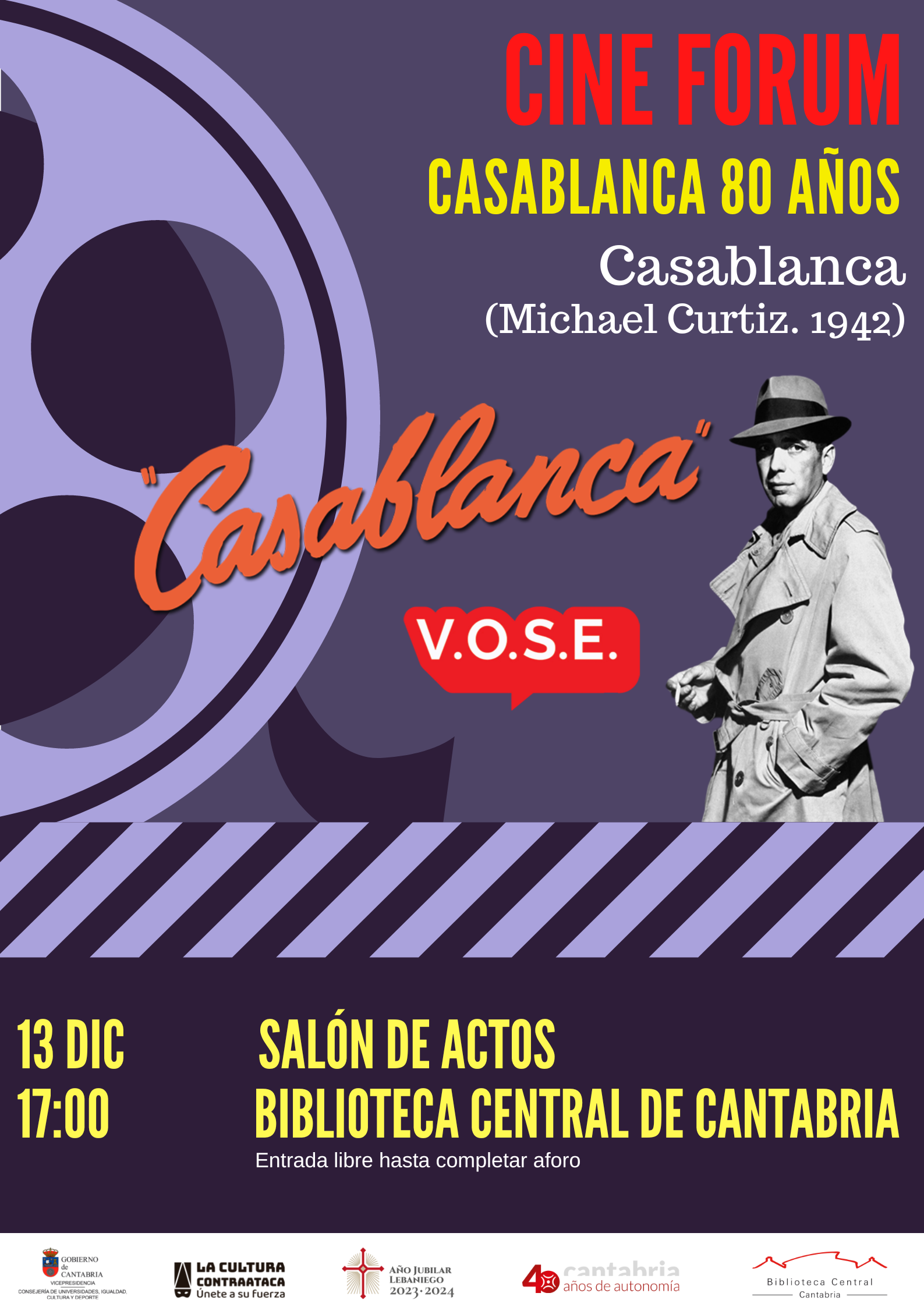 El cine-fórum de La Biblioteca Central de Cantabria despide 2022 con dos proyecciones de grandes clásicos del cine. El 13 de diciembre, a las 17:00 h, se proyectará en VOSE la película de Michael Curtiz, “Casablanca” (1942) con motivo de los 80 años de su estreno.