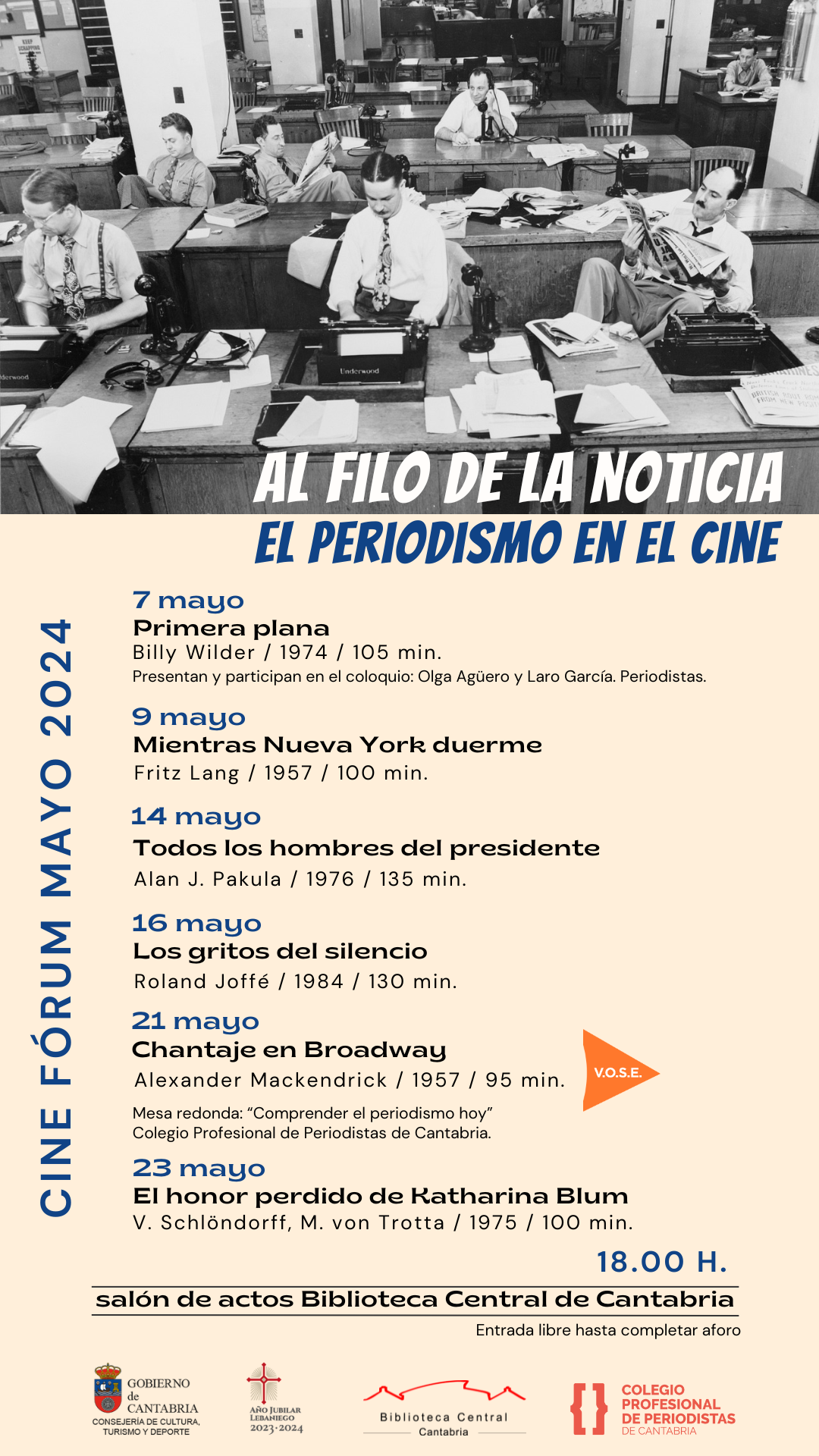 La Biblioteca Central de Cantabria, en colaboración con el Colegio Profesional de Periodistas de Cantabria, pone en marcha durante el mes de mayo un ciclo de cine integrado por seis proyecciones que pretende acercar al espectador la estrecha relación entre cine y periodismo a través de diferentes géneros como el periodismo de guerra, sensacionalista, de investigación, de crítica teatral o del día a día.