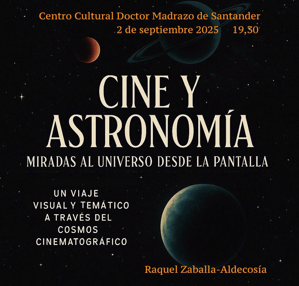 El primer martes no festivo de cada mes AstroCantabria realiza una charla abierta al público en el Centro Cultural Doctor Madrazo. El martes 2 de septiembre a las 19:30h Raquel Zaballa-Aldecosía nos hablará acerca de "Cine y Astronomía: Miradas al Universo desde la pantalla".