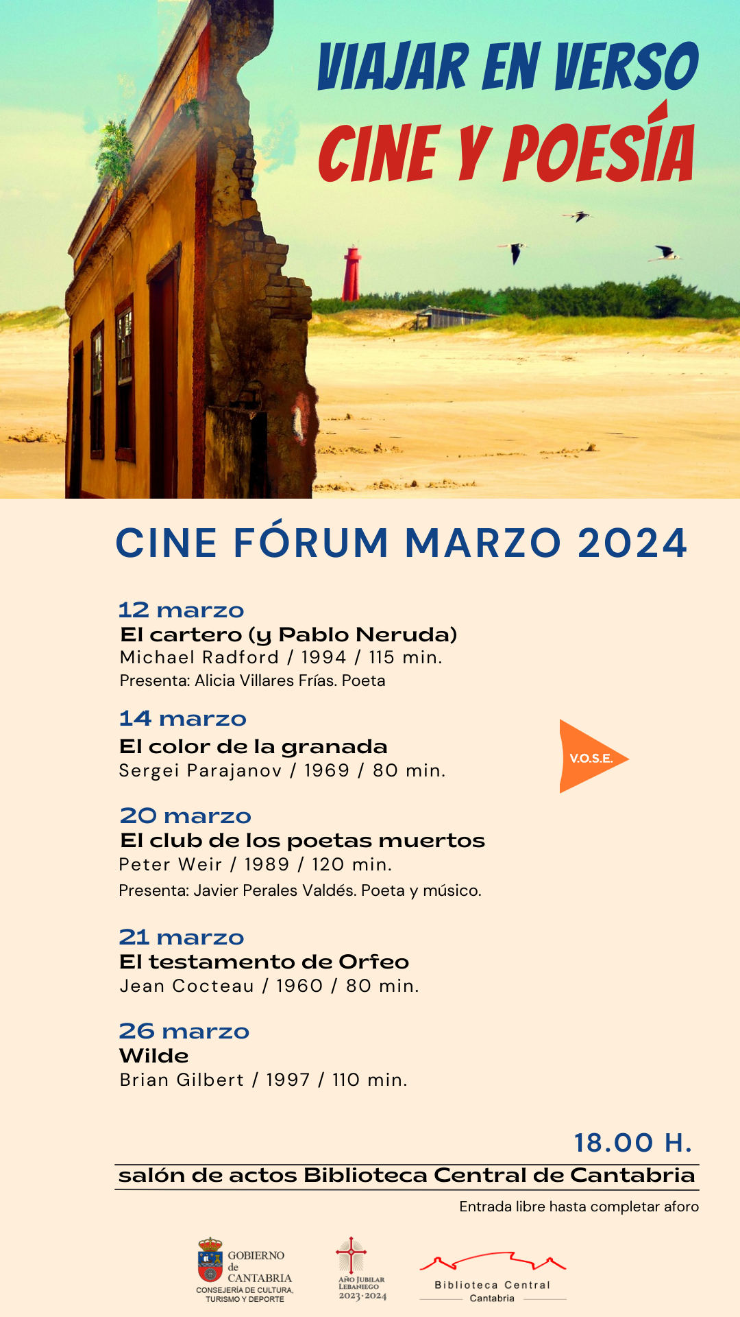 La Biblioteca Central de Cantabria continúa su programación de cine-fórum en marzo con un ciclo de cinco proyecciones sobre la relación entre la creación poética y el séptimo arte. Coincidiendo con la celebración del Día Mundial de la Poesía, marzo se engalana de versos y muestra la estrecha relación entre estas dos artes en su cualidad de comunicar emociones intensas de forma rápida y sintética, utilizando para ello imágenes que producen emociones inmediatas. La presentación de algunas de las películas contará con la presencia de poetas cántabros.