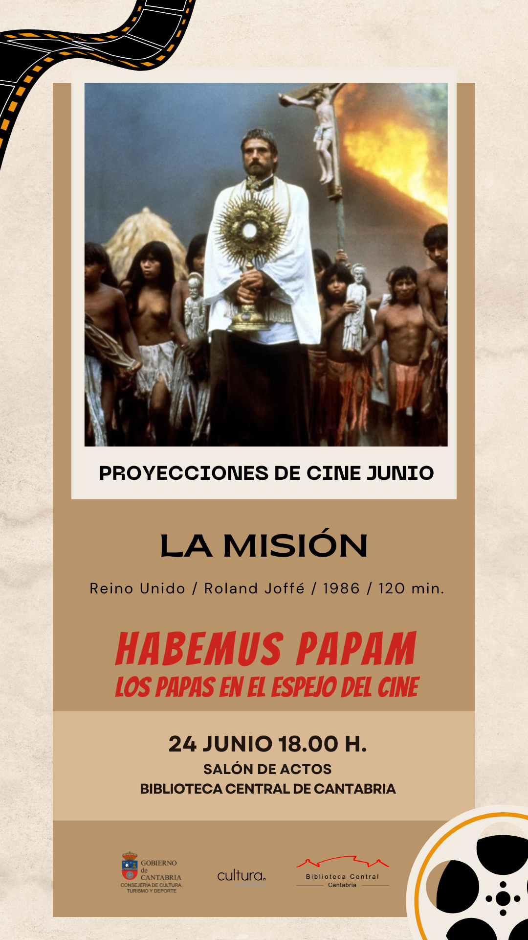 La Biblioteca Central de Cantabria programa en el mes de junio el ciclo de cinefórum “Habemus Papam. Los Papas en el espejo del cine”. El programa lo conforman cinco proyecciones que van desde largometrajes con argumentos que recrean, en mayor o menor medida, la vida de algunos destacados pontífices, algunos de ellos adaptaciones de obras literarias, hasta biopics o películas documentales basadas en figuras más recientes.