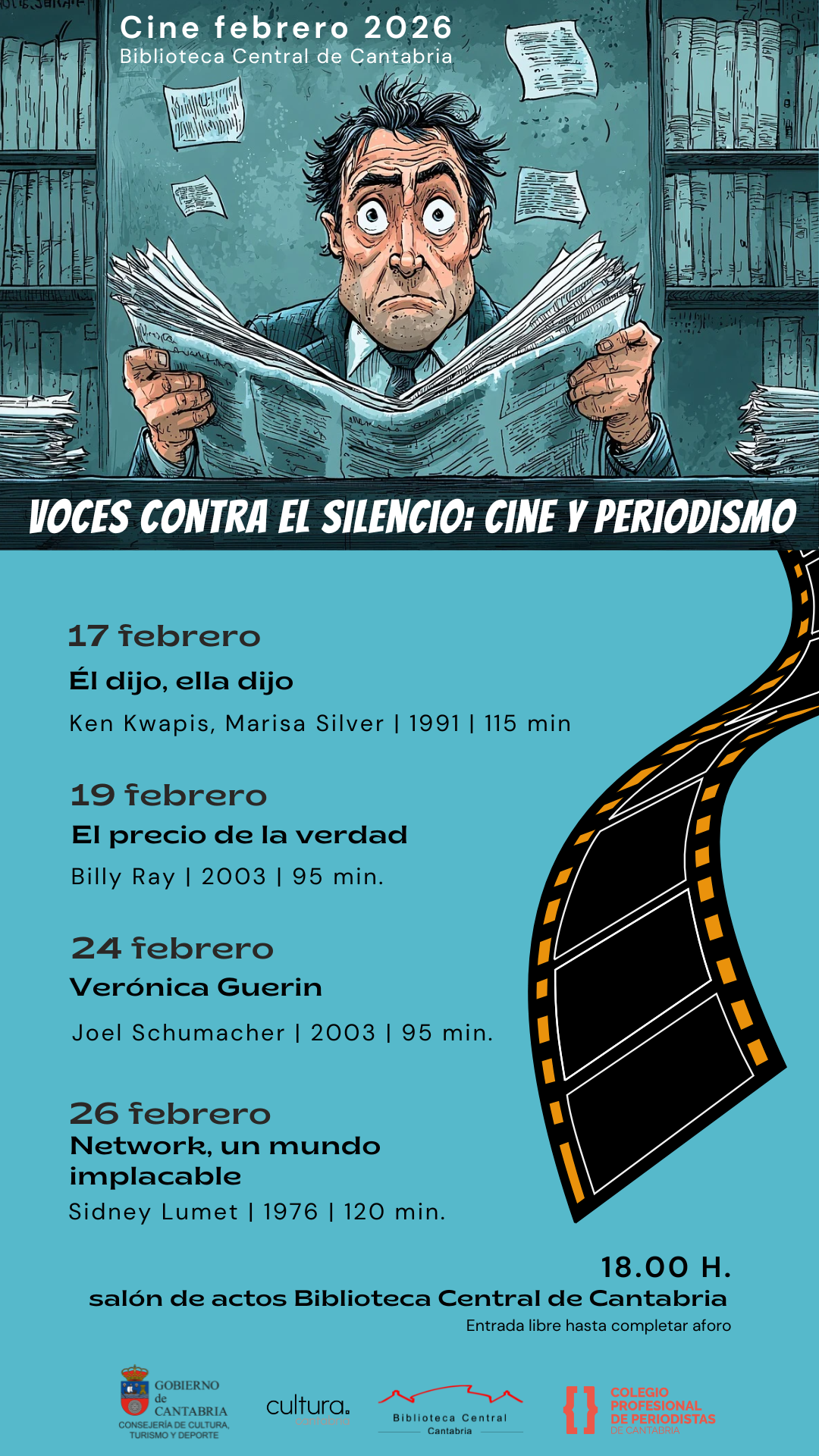 La Biblioteca Central de Cantabria, en colaboración con el Colegio Profesional de Periodistas de Cantabria, pone en marcha durante el mes de febrero un ciclo de cine integrado por cuatro proyecciones que pretende acercar al espectador la estrecha relación entre cine y periodismo a través de diferentes géneros.