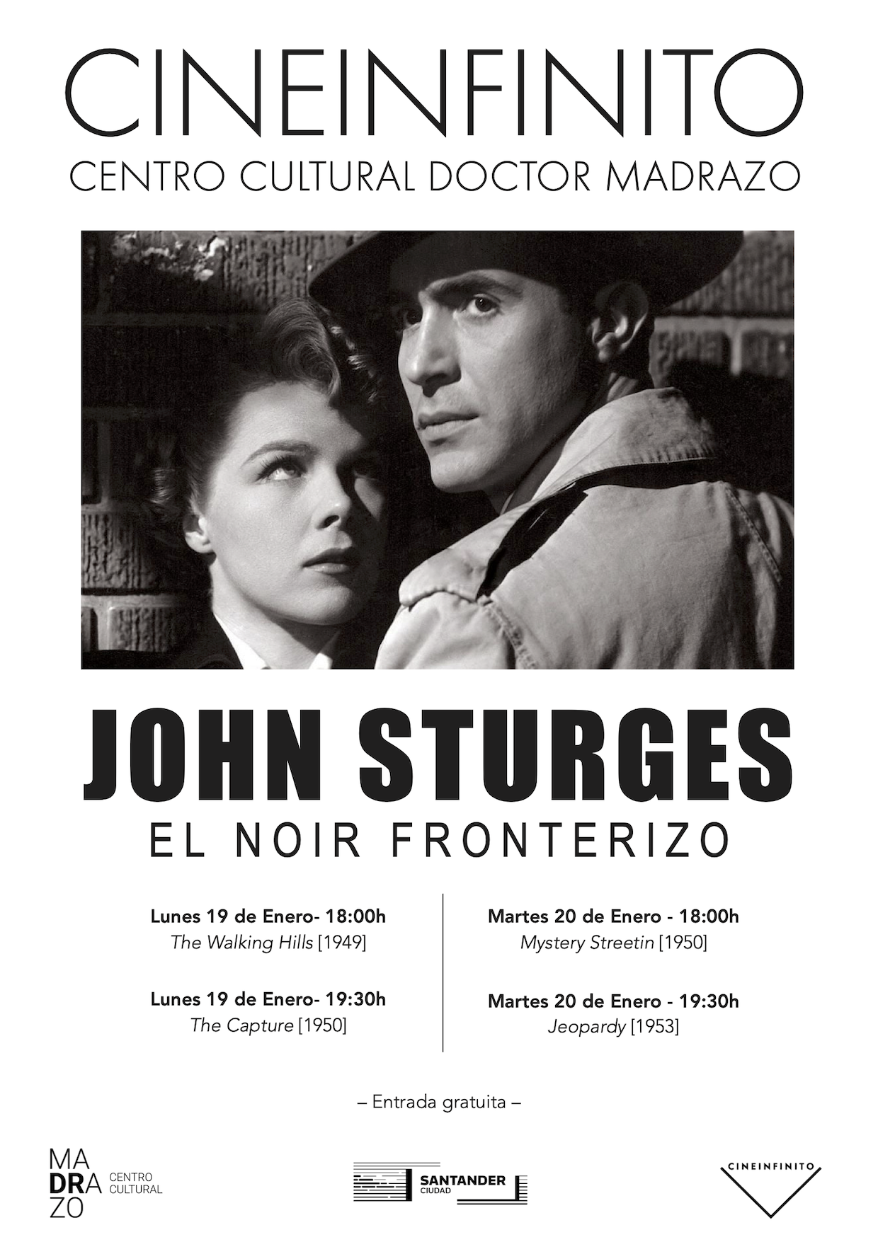 El lunes 19 y el martes 20 de enero de 2026, la asociación Cineinfinito proyectará el ciclo John Sturges. El noir fronterizo en el Doctor Madrazo. Serán cuatro películas en total, que tendrán lugar a las 18:00 h y a las 19:30 h.