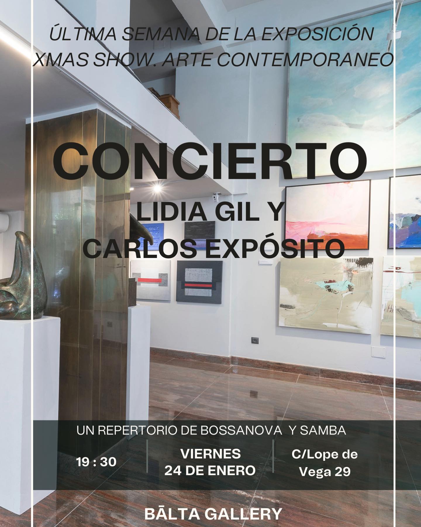 El viernes 24 de enero a las 19:30h Lidia Gil y Carlos Expósito tocarán bossa nova y samba para clausurar la exposición de pintura internacional “Xmas Show”, que se ha podido disfrutar en Balta Gallery, (c/ Lope de Vega nº 29, Santander) desde el pasado 13 de diciembre.