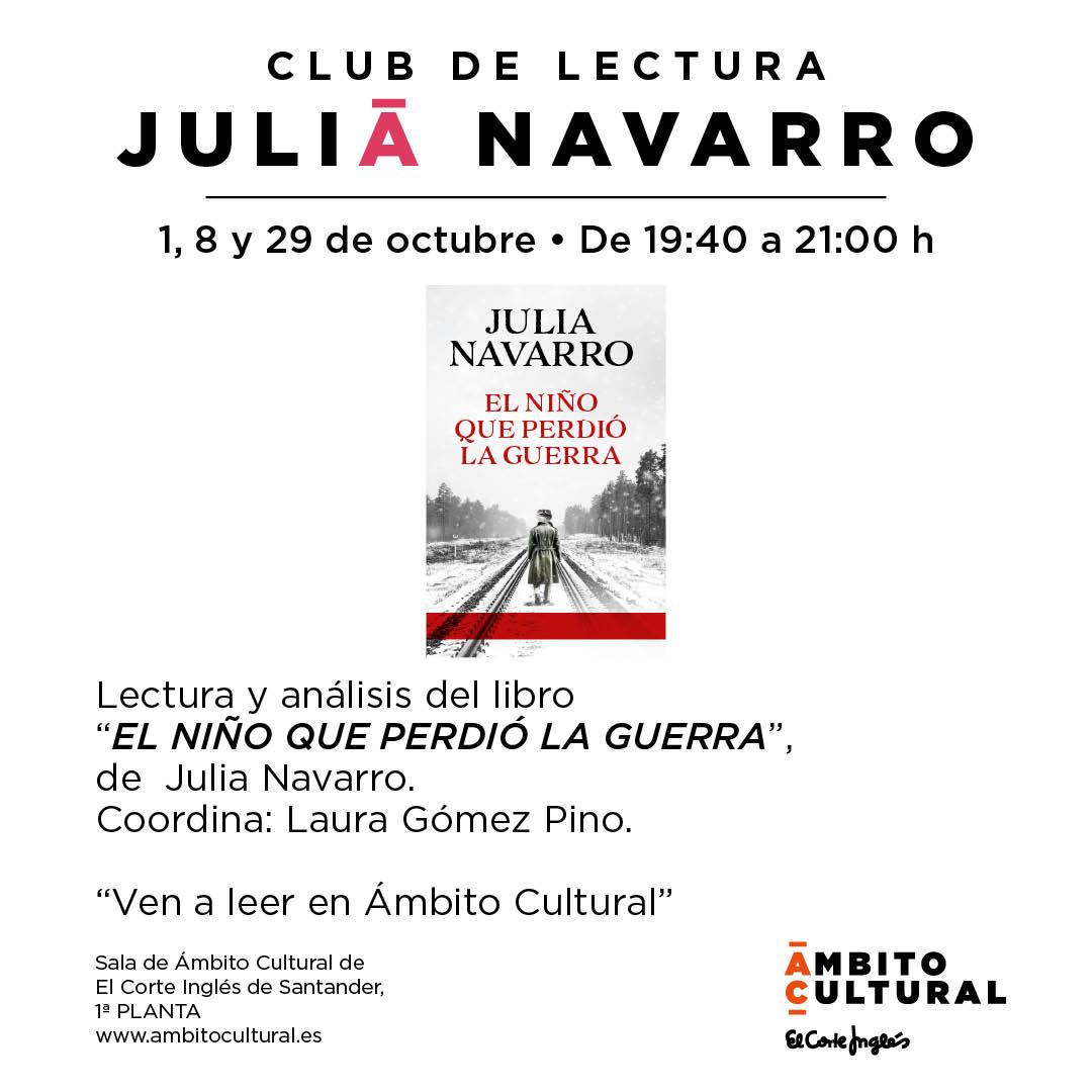 Ámbito Cultural Santander retoma la actividad del club de lectura . Los martes 1, 8 y 29 de octubre de 2024, en horario de 19:40 a 21:00 horas, se reunirán los 22 miembros del club para analizar el último libro de Julia Navarro, “El niño que perdió la guerra".