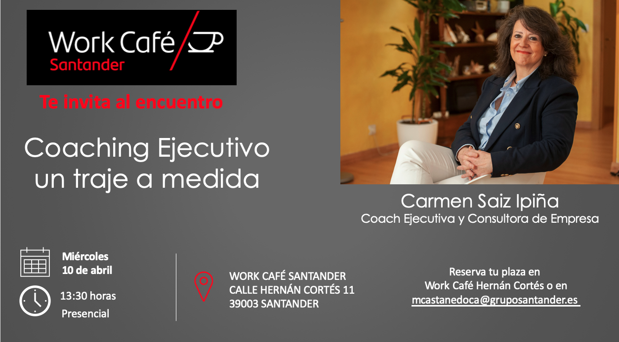 El Work Café Santander de la calle Hernán Cortés organiza este encuentro con Carmen Saiz Ipiña, coach ejecutiva y consultora de empresa, quien hablará a los asistentes acerca de “Coaching ejecutivo, un traje a medida”.