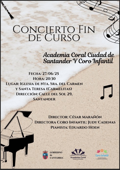 La Academia Coral Ciudad de Santander celebrará el concierto de clausura del curso 24-25 con su Coro Infantil en la Iglesia de los Carmelitas, Parroquia del Carmen y Santa Teresa, el viernes 27 de junio de 2025 a las 20:30h.