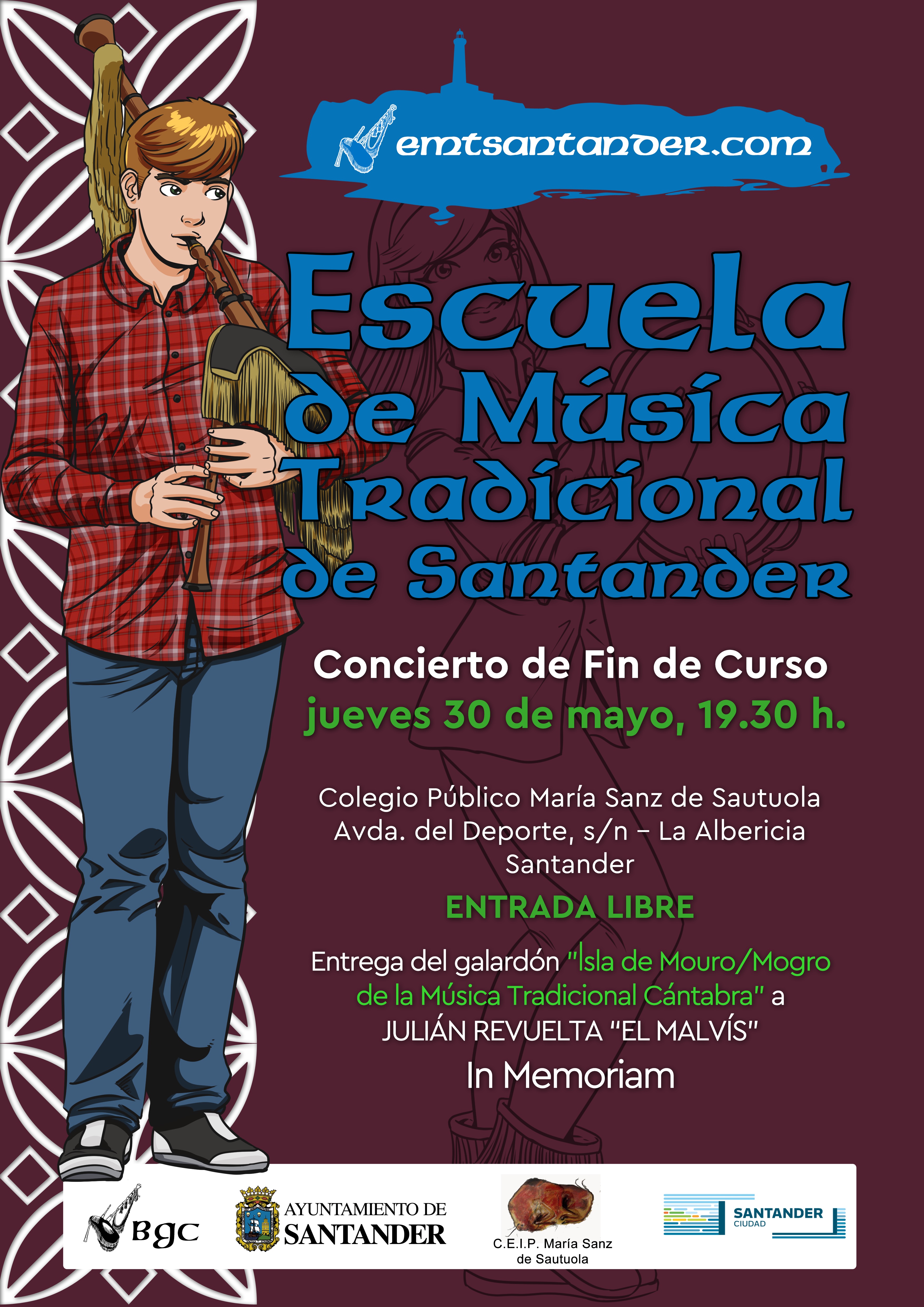 El jueves 30 de mayo a las 19:30 h. se celebrará el concierto de fin de curso 2023-2024 de la Escuela de Música Tradicional de Santander.