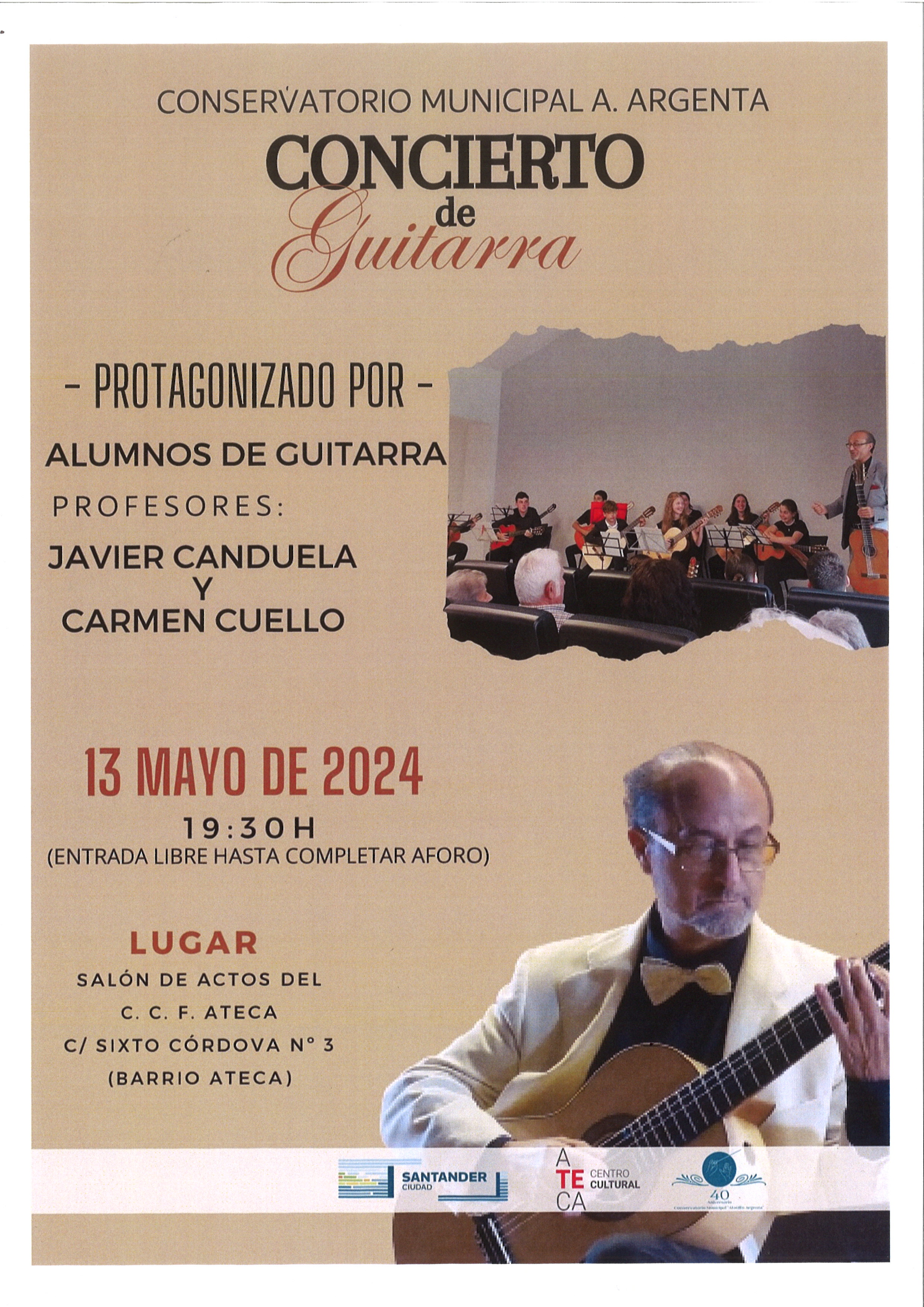 El lunes 13 de mayo, a las 19:30 h, tendrá lugar en el Salón de Actos del Centro Cultural Fernando Ateca, un concierto de guitarra a cargo de alumnos del Conservatorio Ataúlfo Argenta.