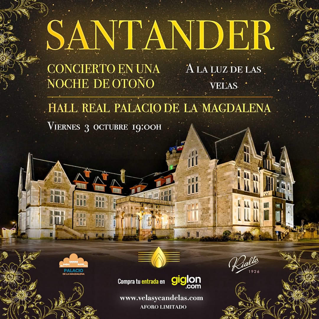 Prepárate para una noche mágica que da la bienvenida al otoño en el majestuoso Hall Real del Palacio de la Magdalena en Santander. El salón del Hall Real se transforma en un escenario encantado para un concierto excepcional. Bañado en la cálida luz de cientos de velas, el ambiente se envuelve en un suave resplandor que irradia elegancia y sofisticación, creando una atmósfera íntima y acogedora.