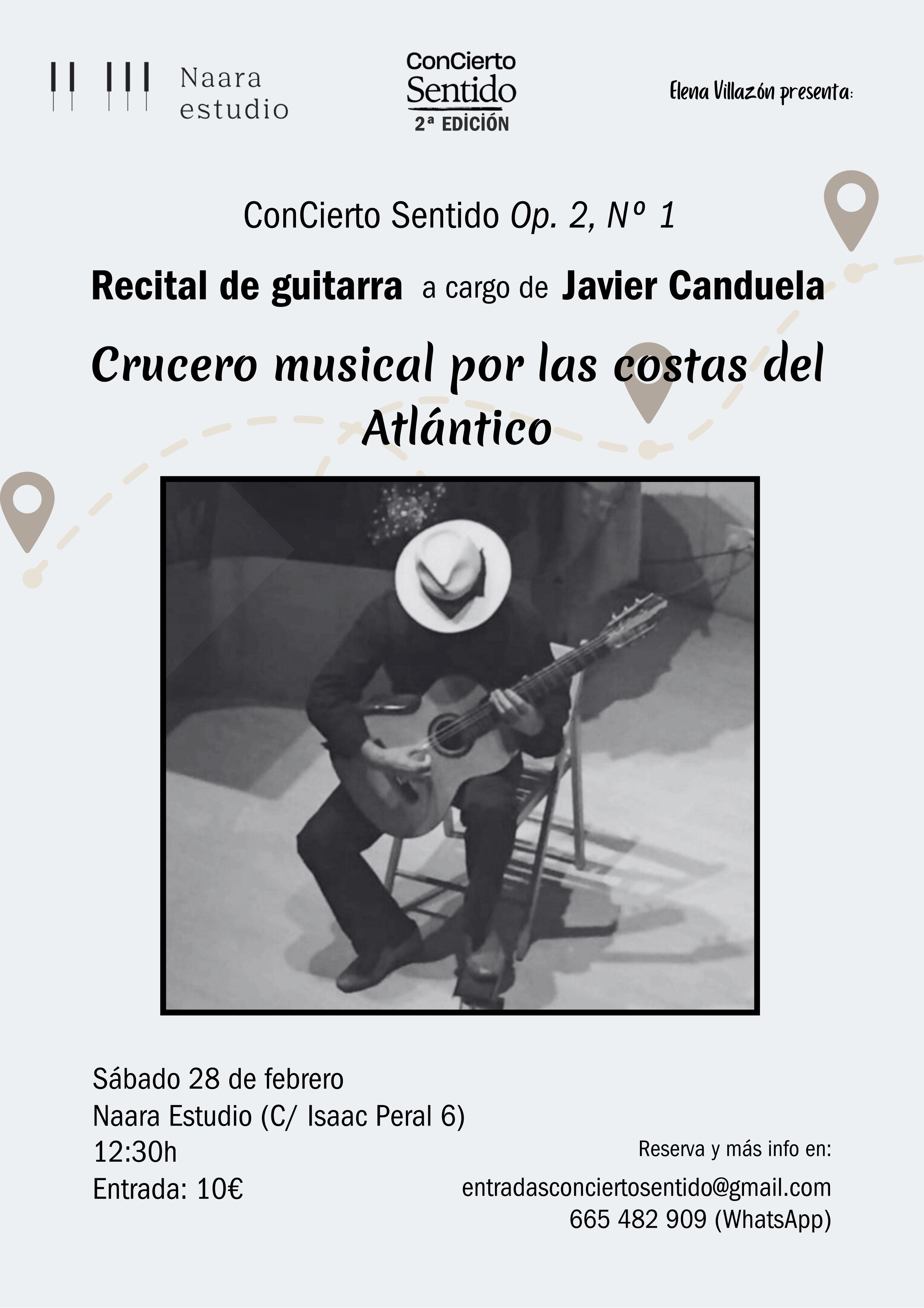 El primer concierto del ciclo será este recital de guitarra de Javier Canduela, titulado “Crucero musical por las costas del Atlántico”. La cita tendrá lugar el sábado 28 de febrero a las 12:30h en Naara Estudio (C/Isaac Peral 6).