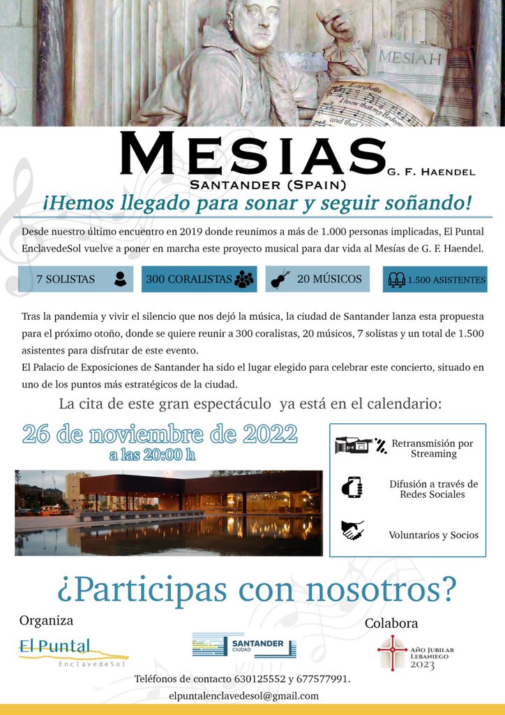 Este recital, bajo la dirección de Manuel Galán, incluirá la parte primera de Adviento y el Aleluya de la obra ‘El Mesías’ de Haendel, que fue estrenada en Dublín en el año 1742 con el objetivo de ayudar a las personas en situación de necesidad.