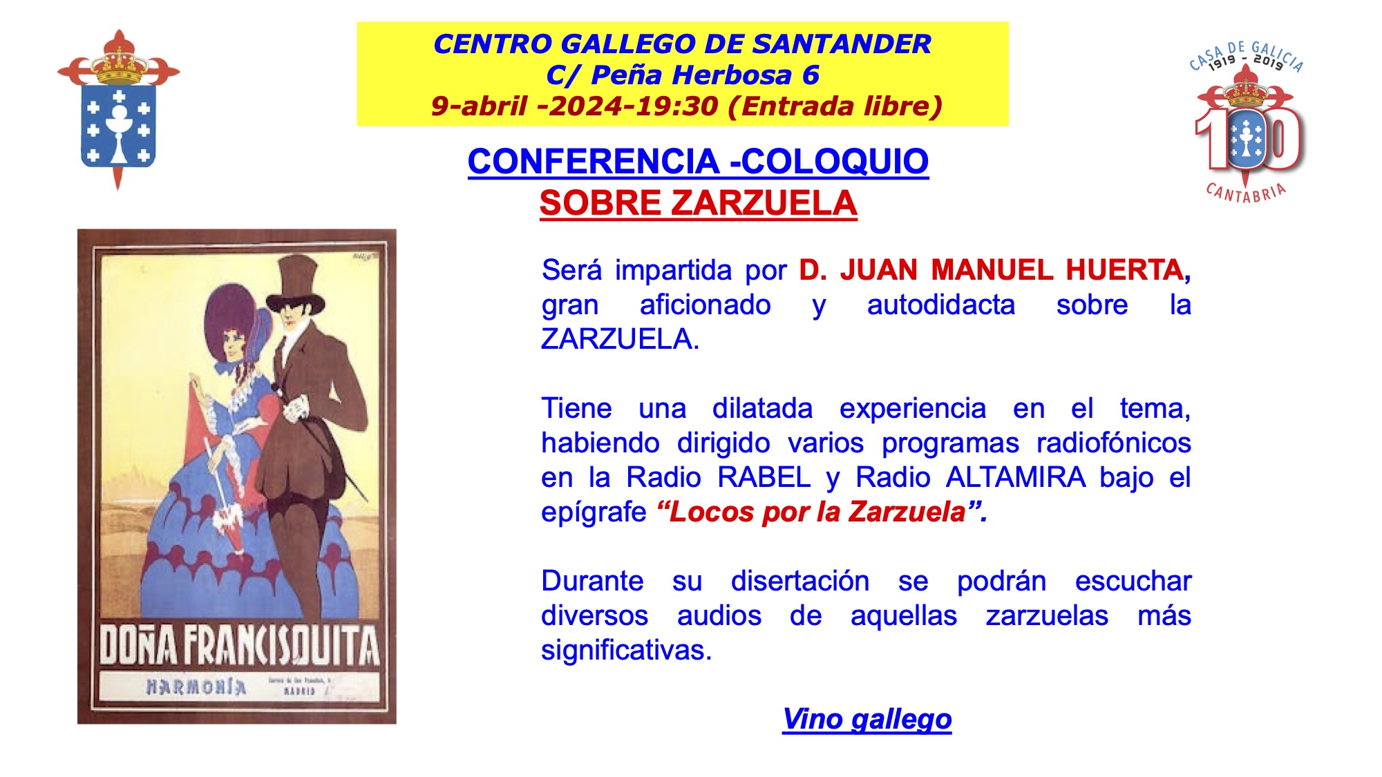 El martes 9 de abril a las19:30 horas, el Centro Gallego de Santander acoge una conferencia-coloquio sobre zarzuela que será impartida por Juan Manuel Huerta, gran aficionado y autodidacta.