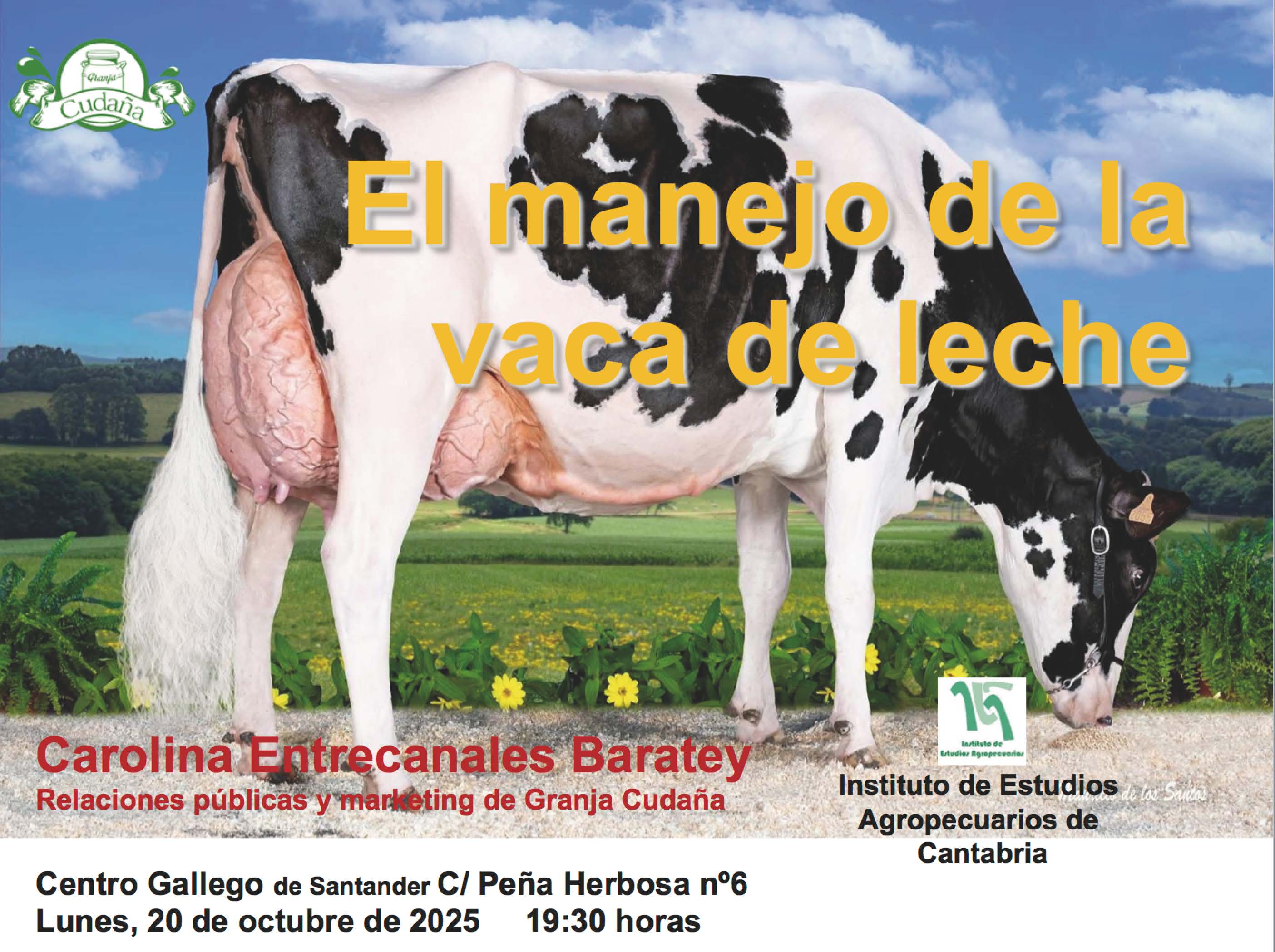 Nos explicará la historia familiar de Granja Cudaña. Hablará sobre la gestión diariamente de una granja de vacas de leche moderna. Los productos lácteos que elaboran. Se celebrará una mesa coloquio para responder a temas concretos ( litros de leche, meses de embarazo, cuándo hay que secar a la vaca, cuando la vaca empieza a dar la leche, donde se ceba, cómo se selecciona, cómo se hace el control lechero, etc) y otras curiosidades.