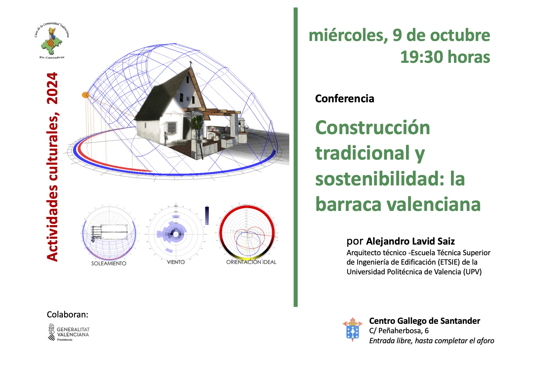 La primera de ellas tendrá lugar el miércoles 9 de octubre a las 19:30 horas y será impartida por Alejandro Lavid Saiz, arquitecto técnico, quien hablará acerca de "Construcción tradicional y sostenibilidad: la barraca valenciana".