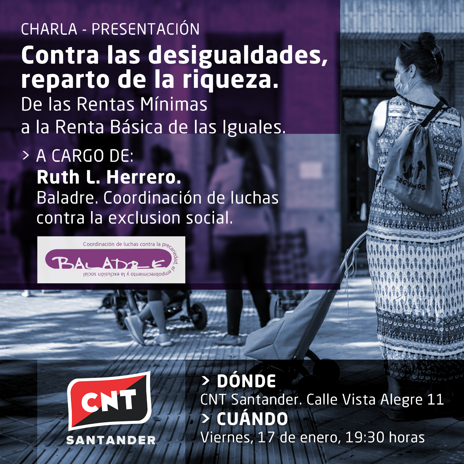 El viernes 17 de enero a las 19:30 la sede de CNT Santander acogerá una charla debate en torno a la renta básica con el nombre “Contra las desigualdades, reparto de la riqueza. De las Rentas Mínimas a la Renta Básica de las Iguales”, a cargo de Ruth L. Herrero de “Baladre. Coordinación de luchas contra la exclusión social”.