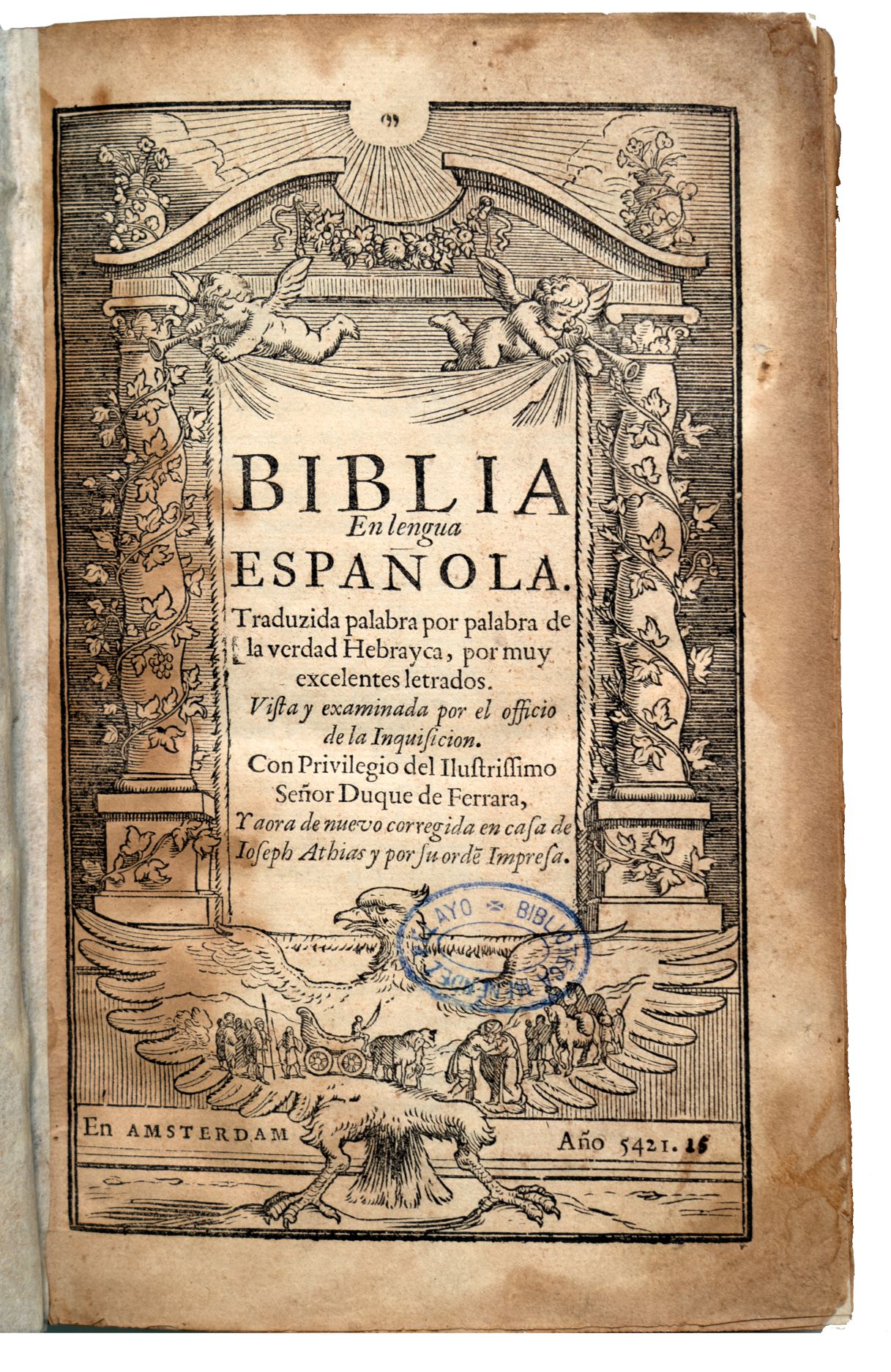 La Biblia de Ferrara, “Biblia en lengua Española traducida palabra por palabra del verdad Hebraica por muy excelentes letrados vista y examinada por el officio de la Inquisición”. Fue impresa en Ferrara, Italia, en 1553. Los traductores fueron Abraham Usque y Yom Tob Atías, también conocidos por sus nombres de conversos Duarte Pinel y Jerónimo de Vargas, marranos oriundos de Portugal y España afincados en Ferrara.