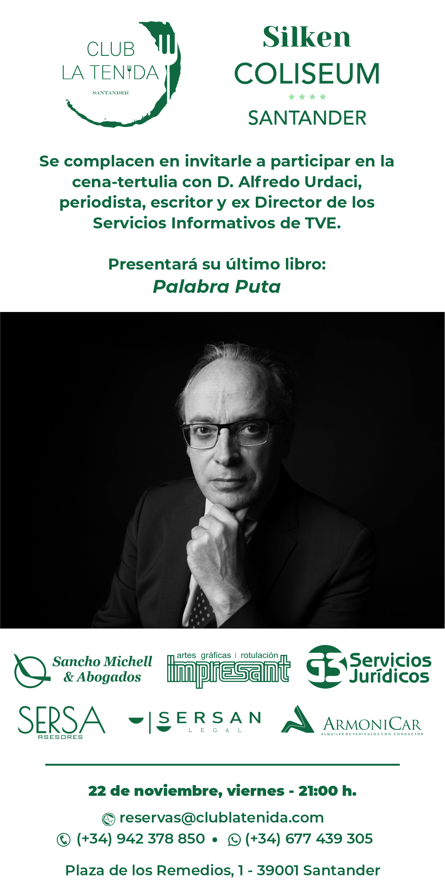 El periodista y escritor navarro Alfredo Urdaci presenta su último libro “Palabra puta. Voces de la prostitución” (Gaveta Ediciones, 2023) durante la cena-tertulia que tendrá lugar el próximo 22 de noviembre, viernes, a las 21:00h en el Hotel Silken Coliseum de Santander, sede del Club La Tenida. Reservas: reservas@clublatenida.com / 942378850 / 677439305 .
