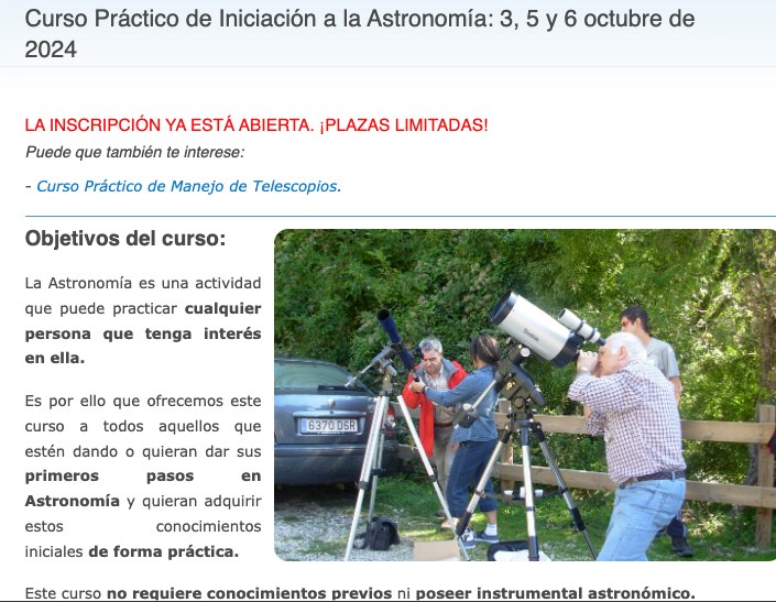- Sesión práctica nocturna: Sábado 5 octubre, 19:00 (observación del cielo nocturno). Lugar por precisar, en las proximidades de Santander.