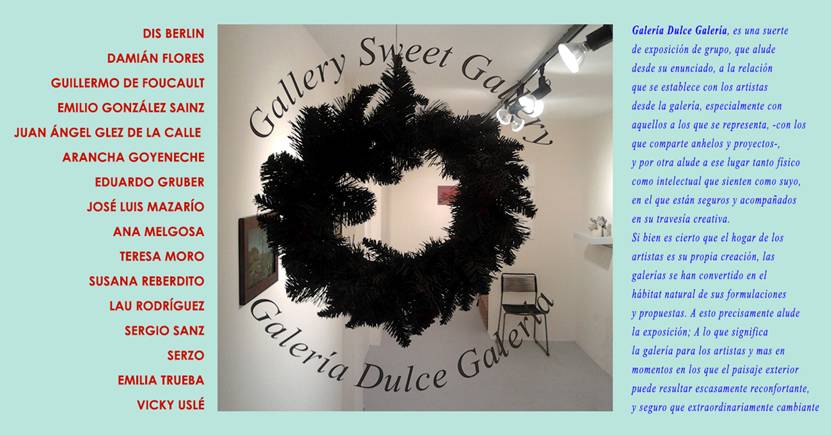 “Galery Sweet Gallery” es una suerte de exposición de grupo cuya primera edición surgió en las navidades de 2012, y que desde entonces viene generando la galería Siboney no necesariamente todos los años. Alude desde su enunciado, a la relación que se establece con artistas desde la galería, especialmente a los que representa, -con los que comparte anhelos y proyectos-, y por otra alude a ese lugar tanto físico como intelectual que ellos sienten como suyo y en el que se sienten cómodos, apoyados, seguros y acompañados en su travesía creativa.