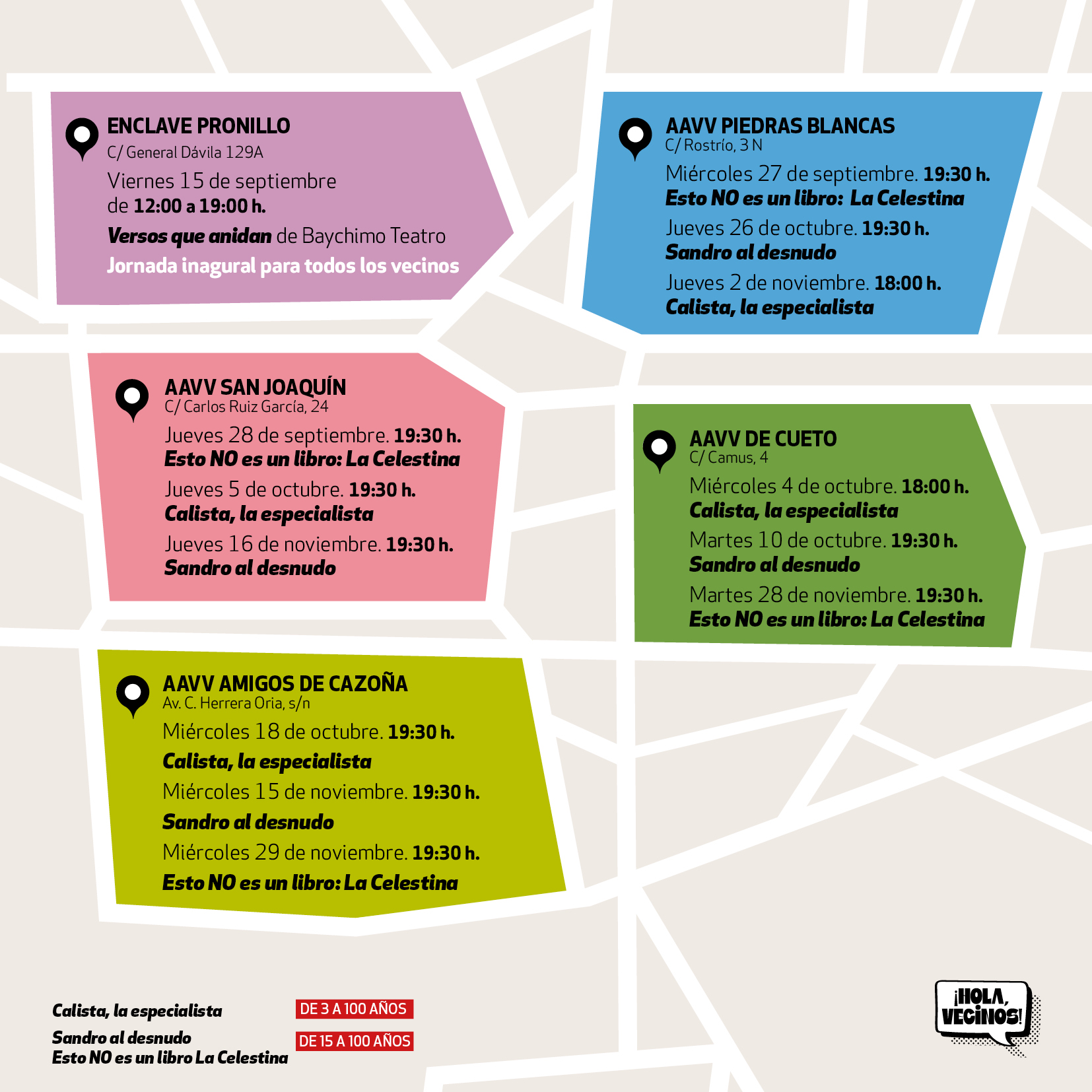 El proyecto ¡Hola, vecinos! de hilo producciones propone una programación de acciones escénicas y espectáculos de narración oral, que abarcan todas las franjas de edad, para acercar a los vecinos en sus barrios el gusto por la poesía, el "había una vez", la literatura universal, nuestros clásicos, y la interpretación en distancias cortas.
